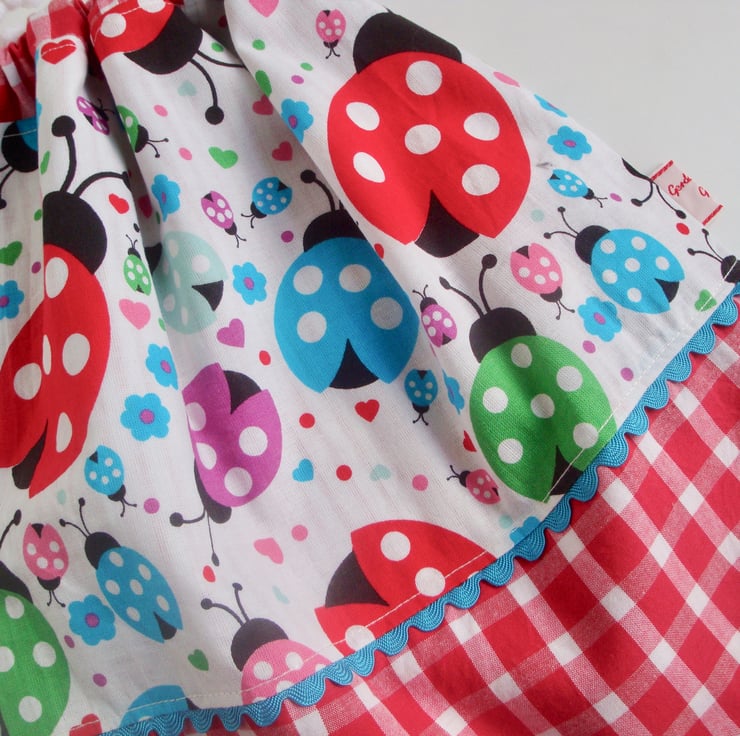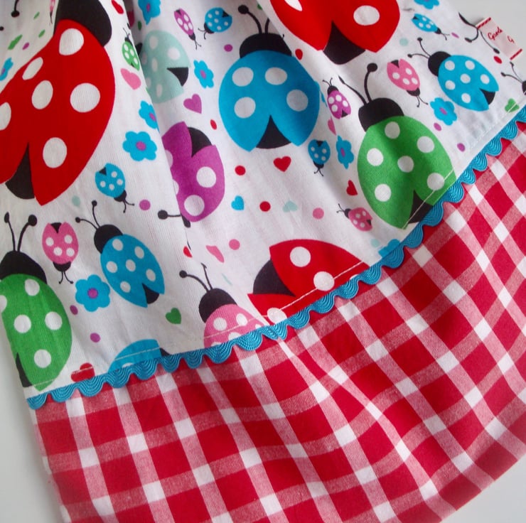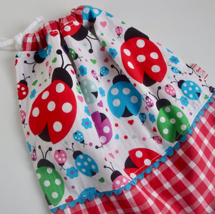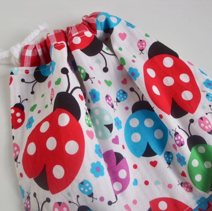 A pretty kids drawstring bag , made in a couple of pretty printed cotton fabric - ladybird & check