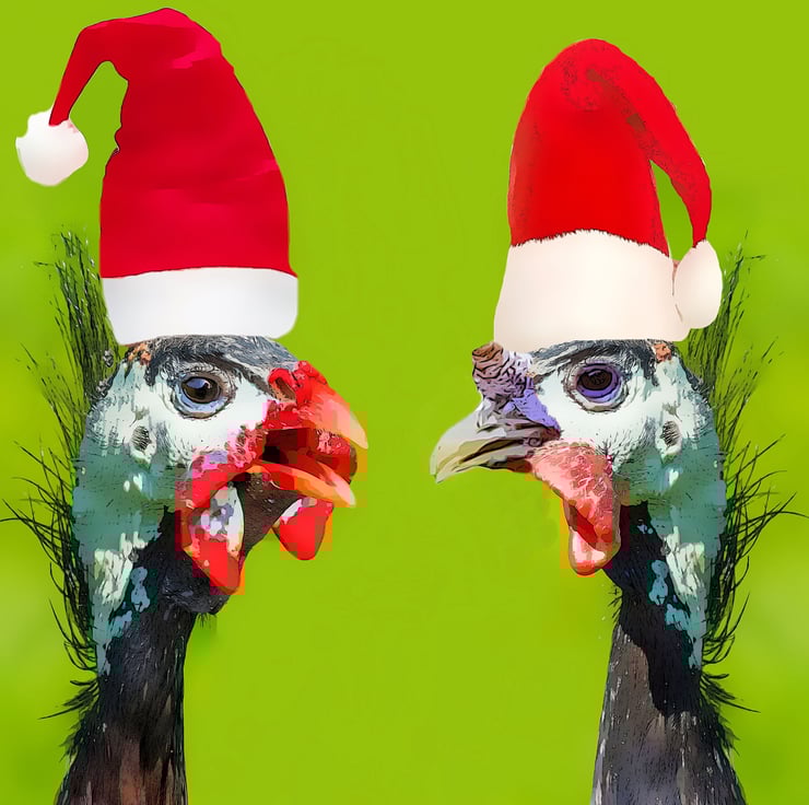 This fun Christmas card of one Guinea Fowl, and one Turkey, with extra large Christmas Hats, will be printed on high quality paper from Paper Spectrum. This a textured, luxury card which has a fine, dimpled, hammered effect across the surface - Pinnacle ETCHING 310gsm Inkjet Card.