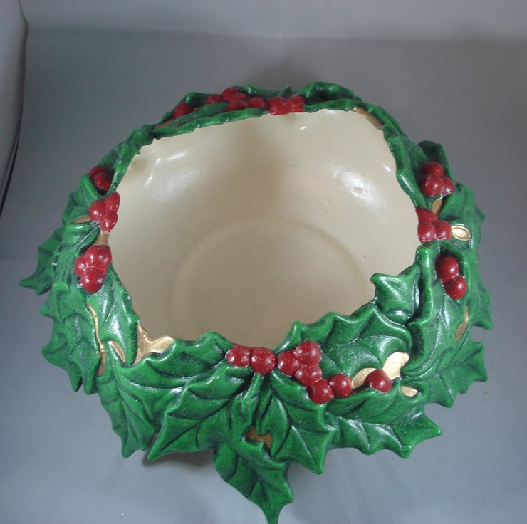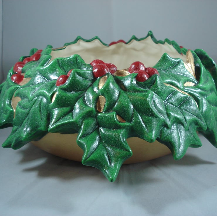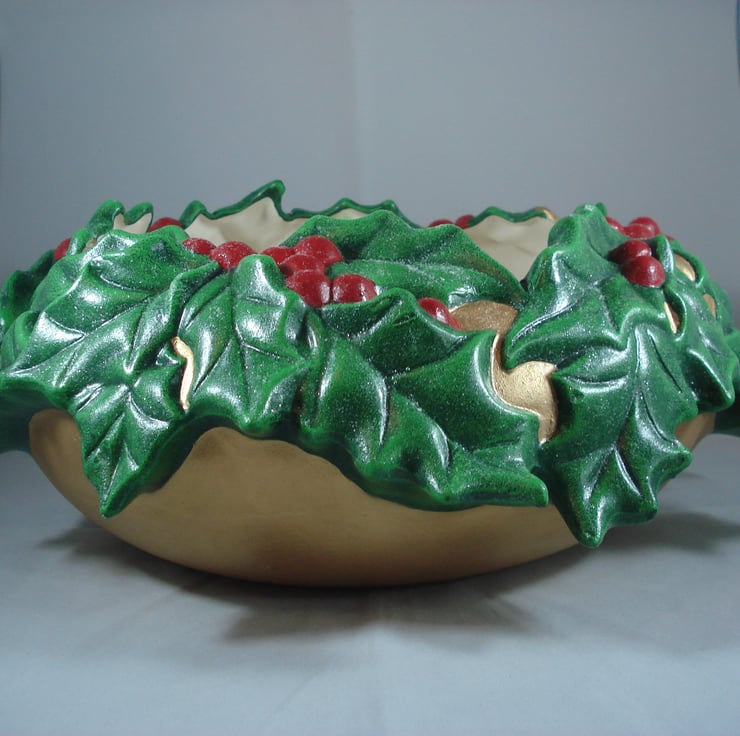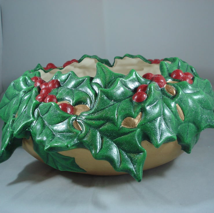 I have for sale a ceramic Christmas table decoration, which was hand painted by myself. It is a large, round decorative bowl, with green holly leaves and red berries all around the top part, with the bottom part in a gold metallic colour. This would make a lovely addition to anyone's Christmas decorations, or perhaps given as a gift.