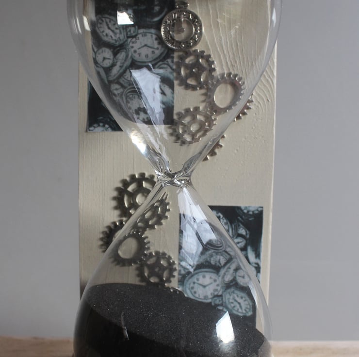 Fixed in a painted wooden holder, decorated with images of different clocks etc. to give them a time based theme.