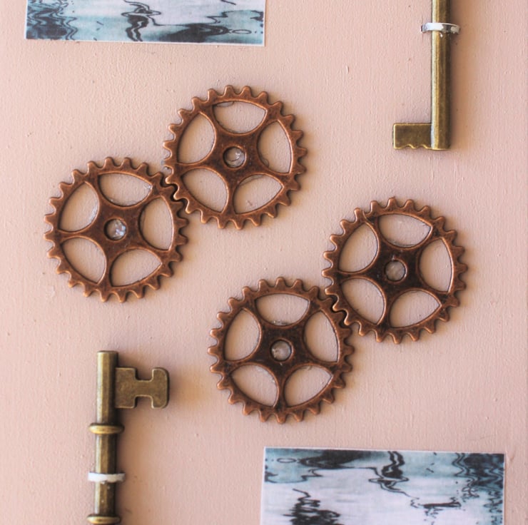 With steampunk clock faces, gears and keys, arranged around the images.