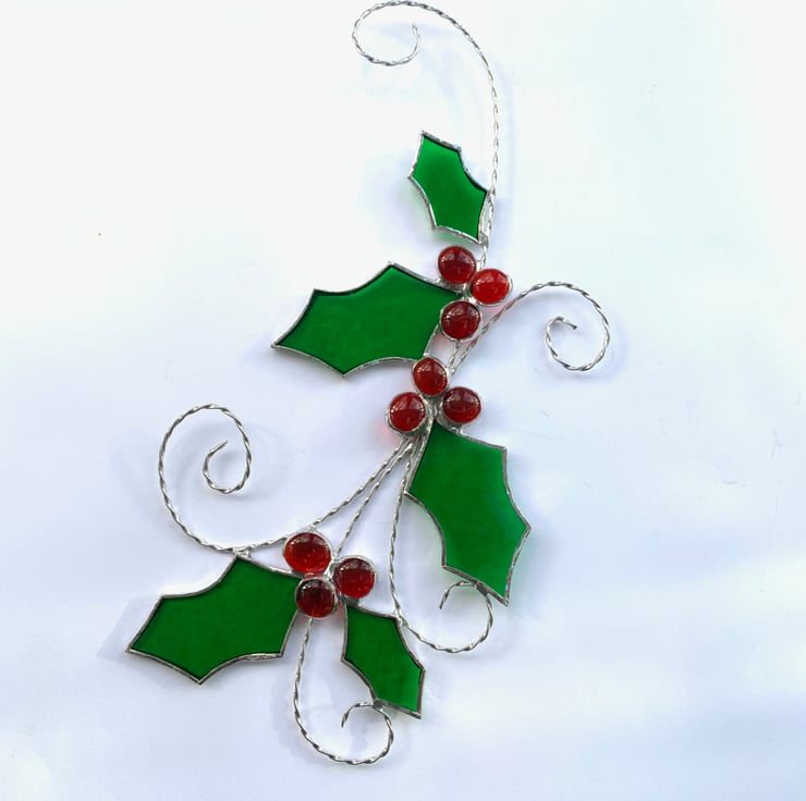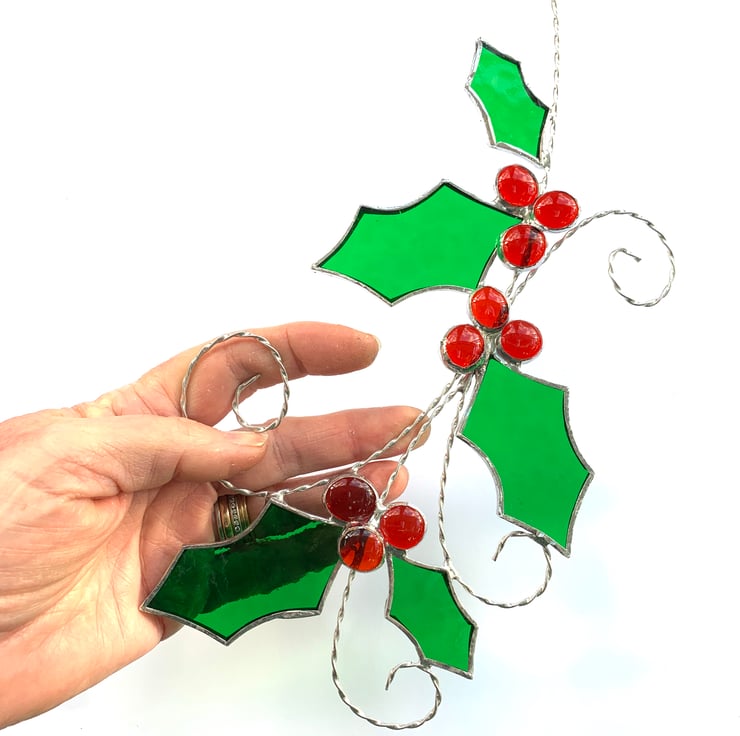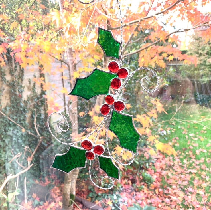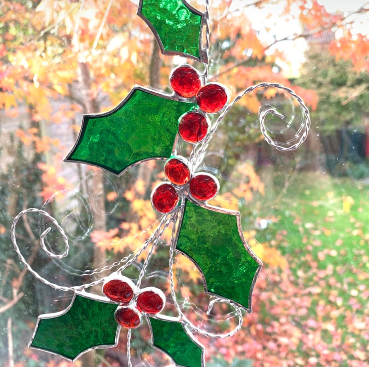 This suncatcher consists of three large holly leaves, two smaller leaves made from green stained glass and nine red glass nuggets for the berries.
