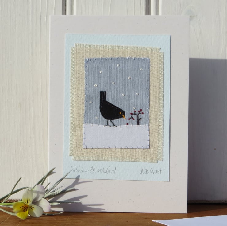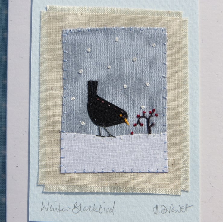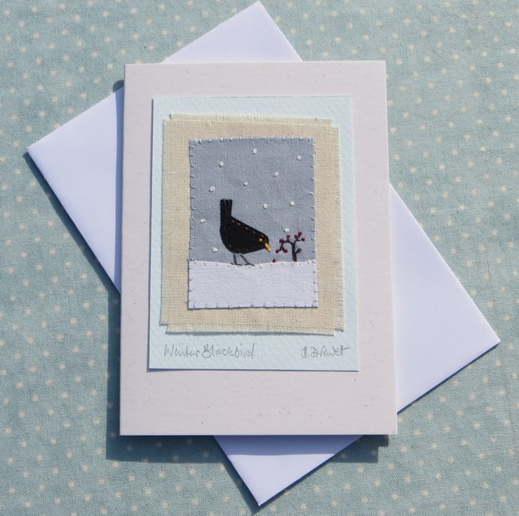 This is a small handmade greeting card featuring a miniature hand-stitched applique made using recycled hand-dyed cotton with intricate embroidered details. It is entitled 'Blackbird with Winter Berries' would be perfect for Christmas, but a winter birthday too, definitely a card to keep!