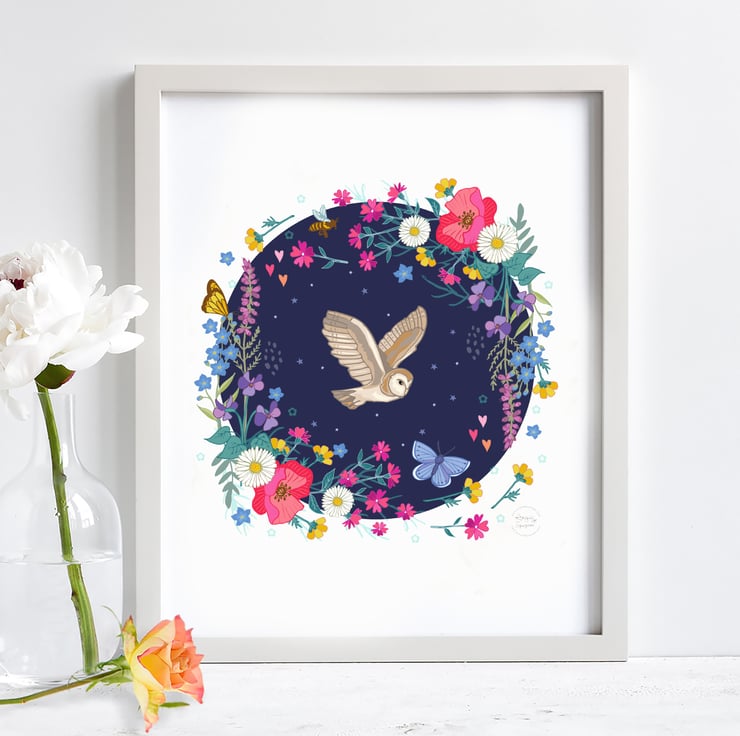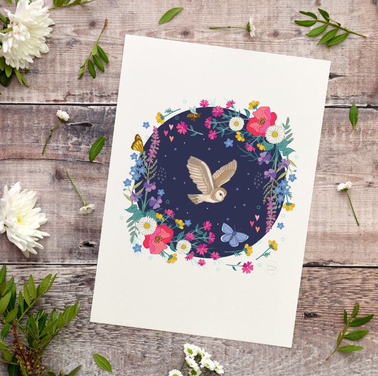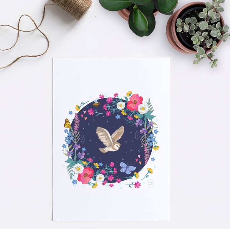 'Barn Owl and Wildflowers' Illustration Print A4 Unframed