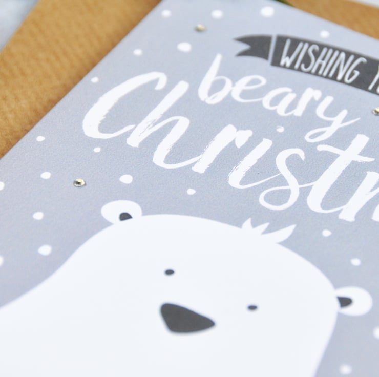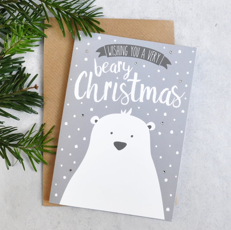 This Christmas card features my original illustration of a cute polar bear in a snowy landscape with the wording 'Wishing you a beary Christmas'. The card is hand-finished with tiny white glass rhinestone for that extra little festive sparkle.