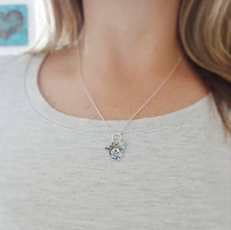 A cluster of handmade charms dangly gently from a small hammered silver loop connected to a dainty silver chain.