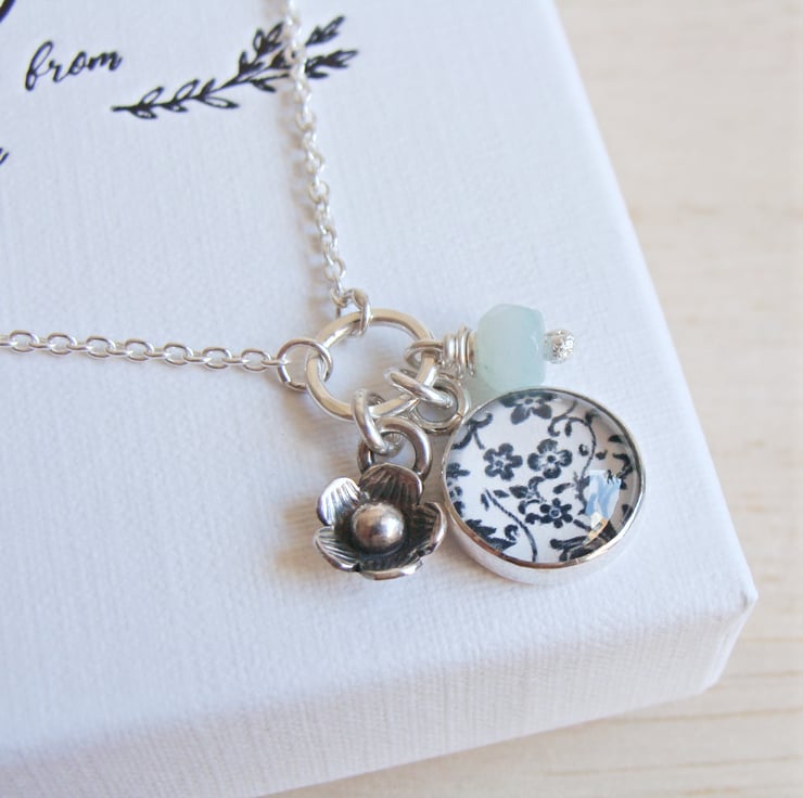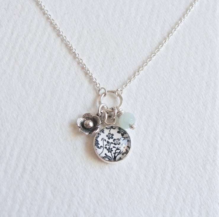 The floral art charm is made using a print of my original illustration. The print is then sealed inside the silver charm underneath clear glass.