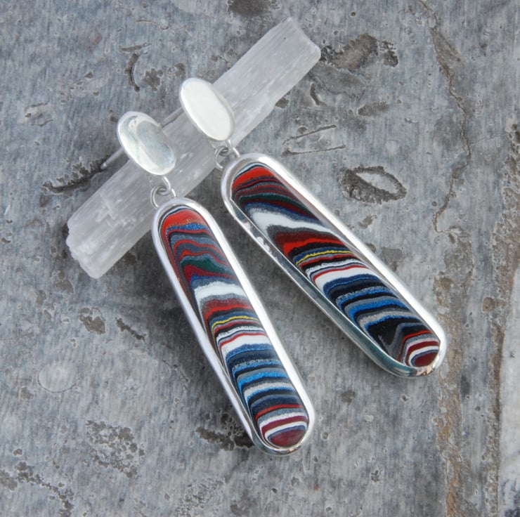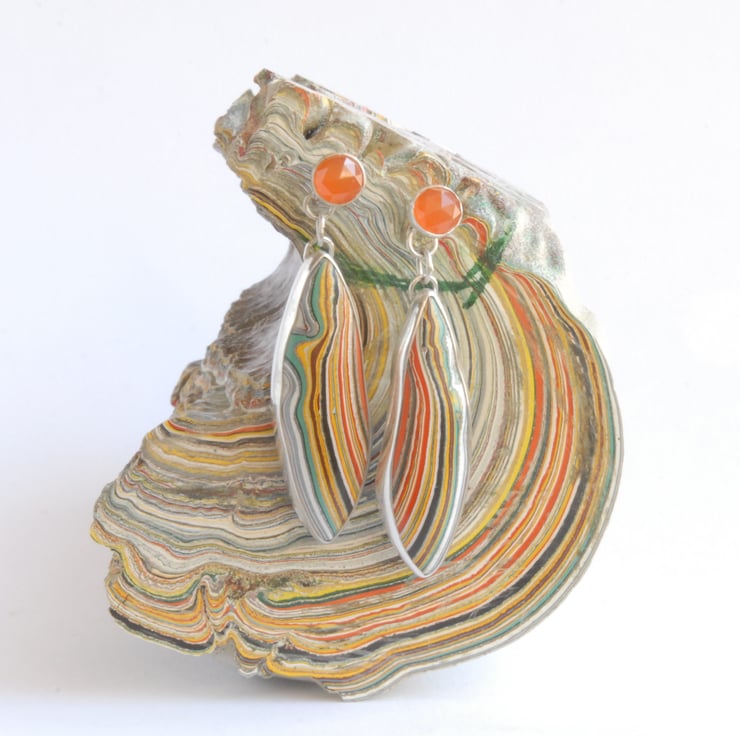 Dagenham fordite earrings (photo 1) measure approx 48mm top to bottom, 12mm wide, fordite is 35mm by 12mm