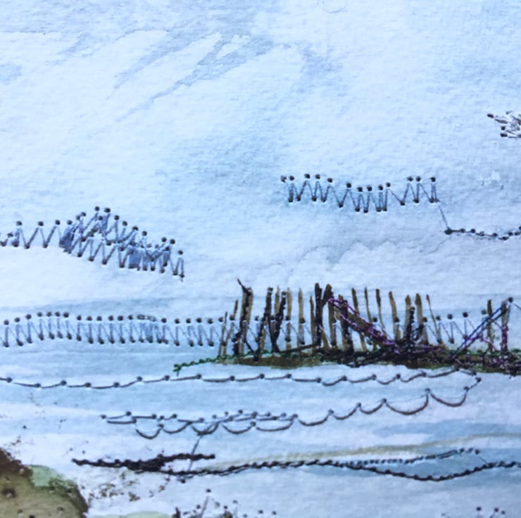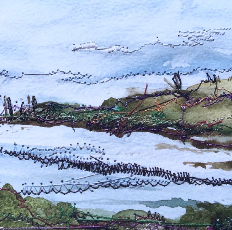 To make my paintings I use a mix of watercolour painting and sewing machine stitches to create a more textured finish, and this gives the landscapes depth and does justice to the melody of colours that can be seen at different times of the year. Sometimes I leave the threads to fall where they may, adding to the natural feel of the painting.
