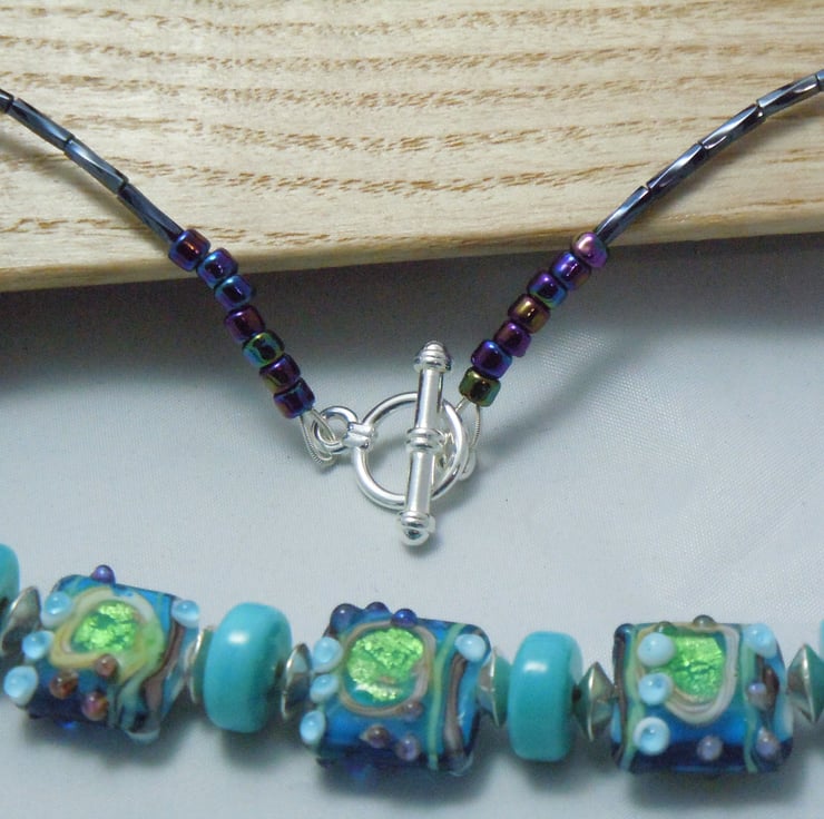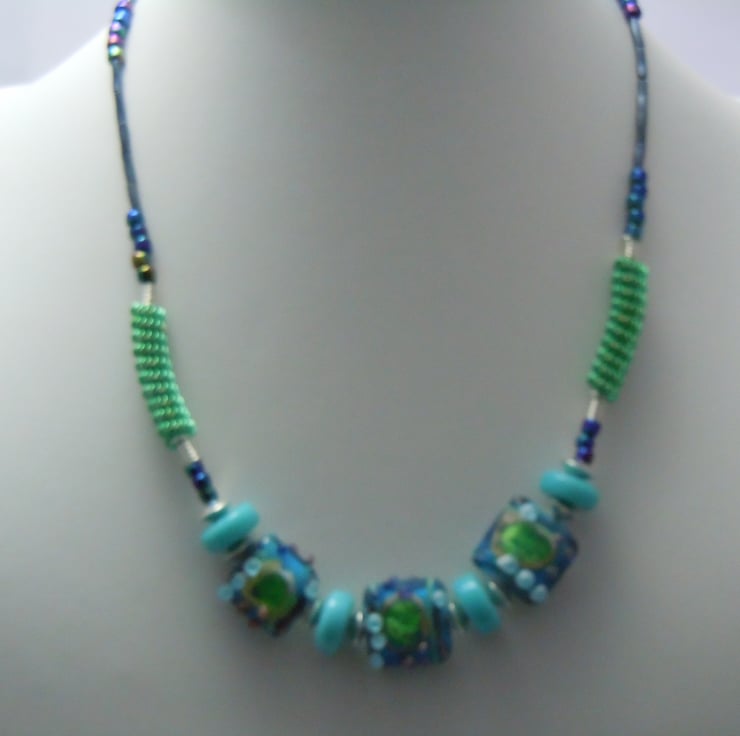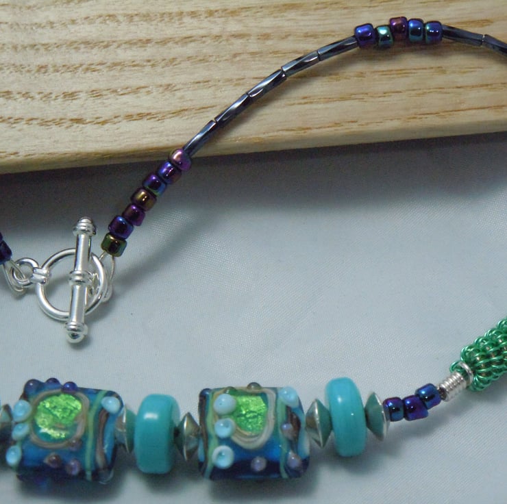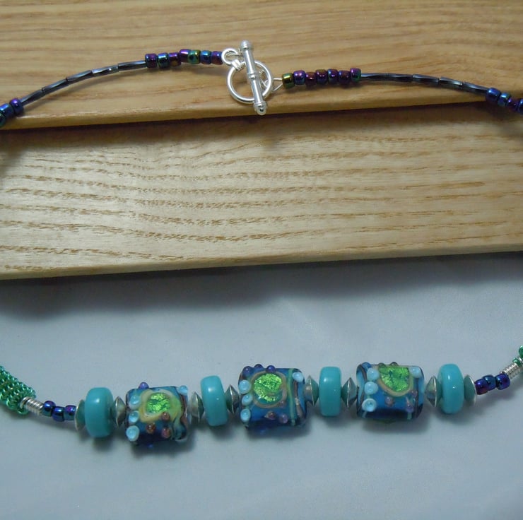 Beautiful lampwork artisan glass bead necklace with green iridescent foil & turquoise blue glass beads also green handmade spiraled wire & iridescent seed & tube beads finished with a silver plate toggle clasp.