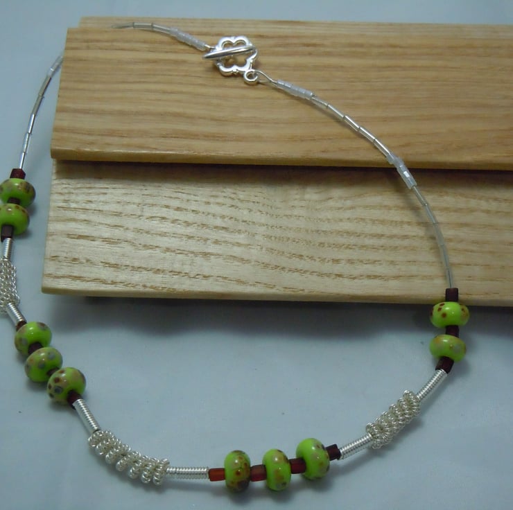 Necklace of mottled green lampwork artisan glass beads with handmade silver plate spiralled wire & glass seed & tube beads finished with a silver plate toggle flower clasp.