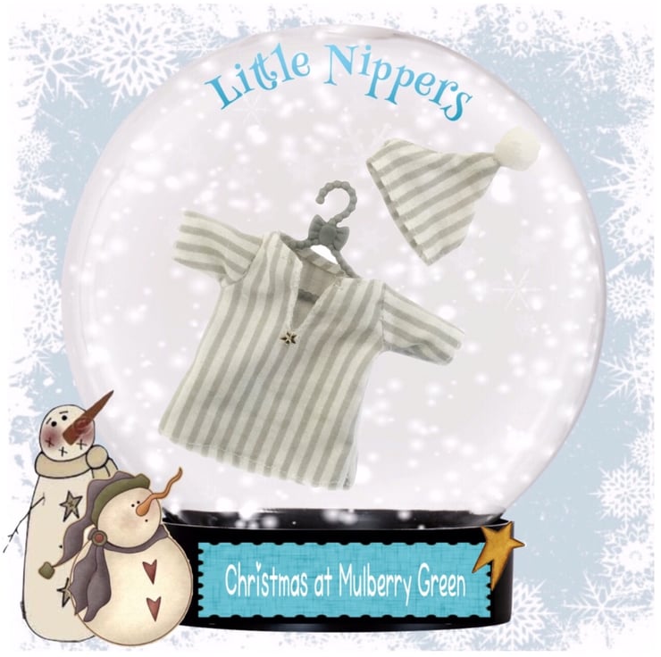 A really cute little nightshirt and matching nightcap set to fit the Little Nippers. The set is in grey and white striped cotton. The nightshirt has a tiny gold star on the front and the nightcap is trimmed with a little white Pom Pom.