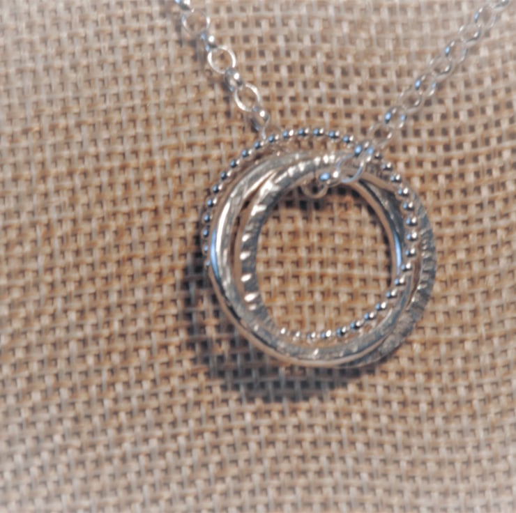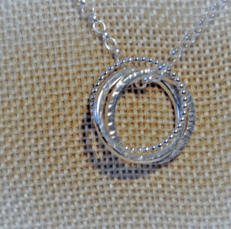 This pendant has been created using three rings and entwined and suspended from an 18 inch chain. One of the rings is made from beaded wire, one has been left plain and the other has been given a texture. The beaded wire is 2 mm and the other two rings are made with 3 mm wire they are all 23 mm. The 18 inch chain is sterling silver and has a simple handmade hook clasp. This would make a lovely gift and a welcome addition to any jewellery collection.