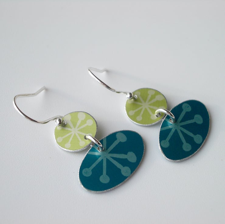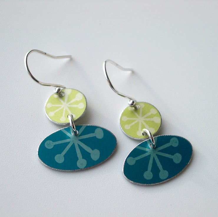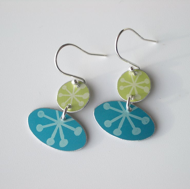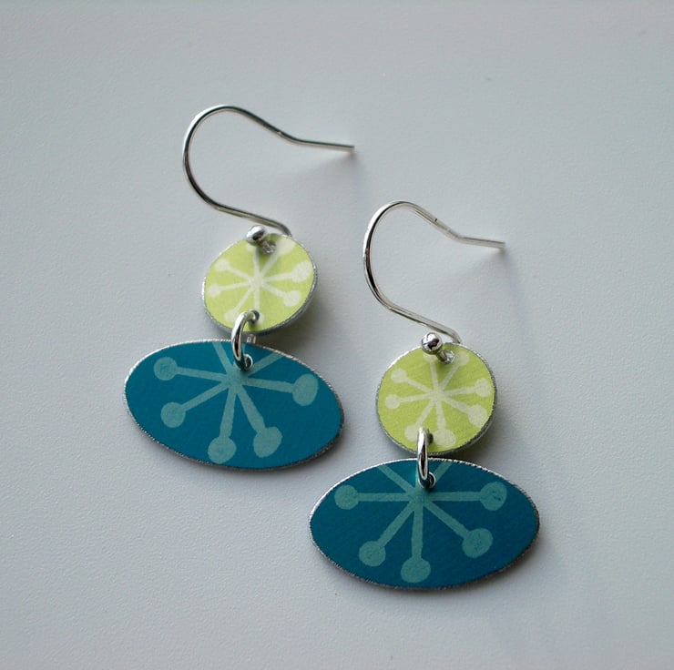 These pretty retro style earrings are inspired by mid century modern art and are made from anodised aluminium which I have dyed in teal and lime and printed with a 1950's style star print. The dye is made permanent by heating the aluminium. I have cut out the circle and pod shape with a piercing saw and filed the edges for a nice smooth finish. The two pieces are linked with a sterling silver hoop and dangle from a sterling silver ear wire. The circle and pod shape together both measure approximately 25mm from top to bottom and the widest part of the pod measures 20mm across.