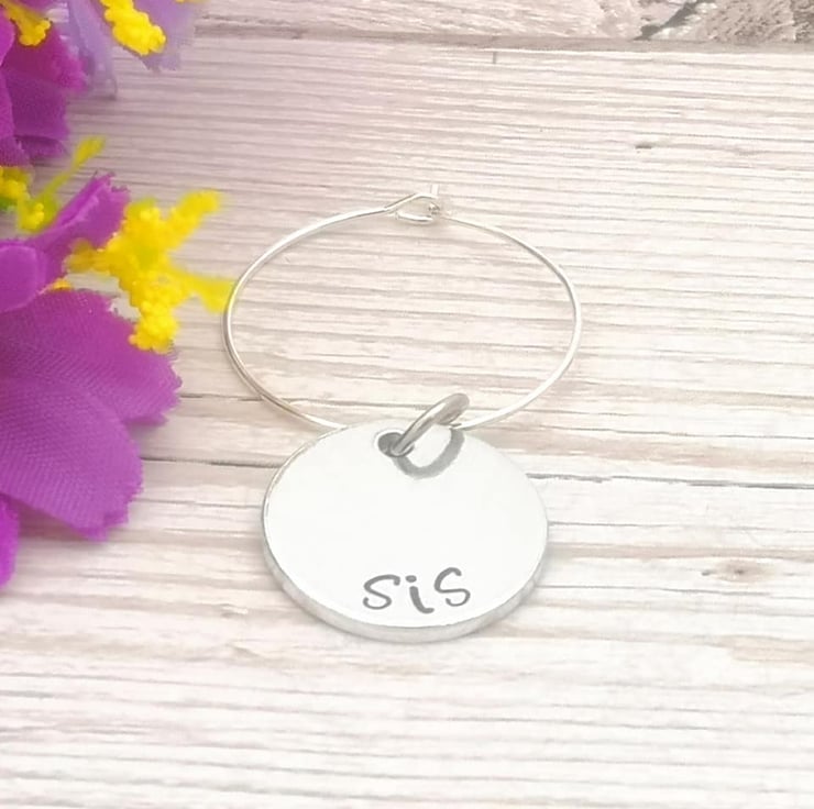 Each wine glass charm will be made to order by hand stamping each individual letter (or number) onto a blank piece of aluminium metal. It is then polished and finished by painting each letter with black ink.