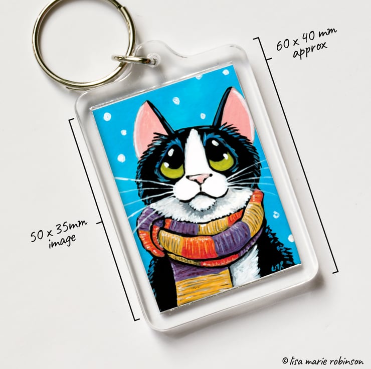 Seasonal wintery tuxedo cat keyring. Design features a painting of a cute black and white tuxedo cat wearing a colourful striped scarf. Even a kitty needs to keep wrapped up warm when they're out enjoying the snow!