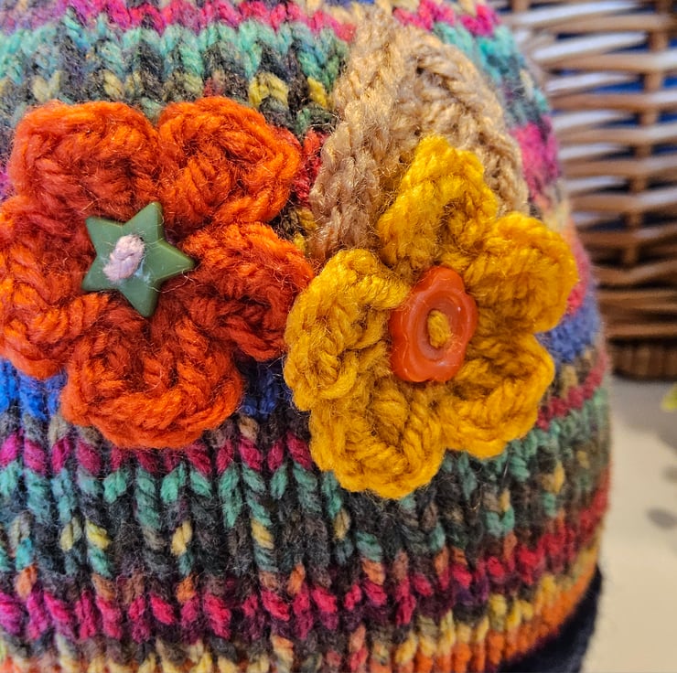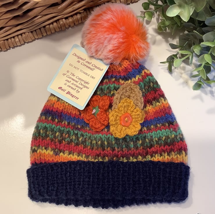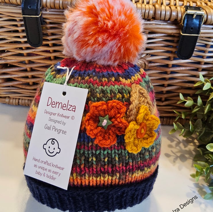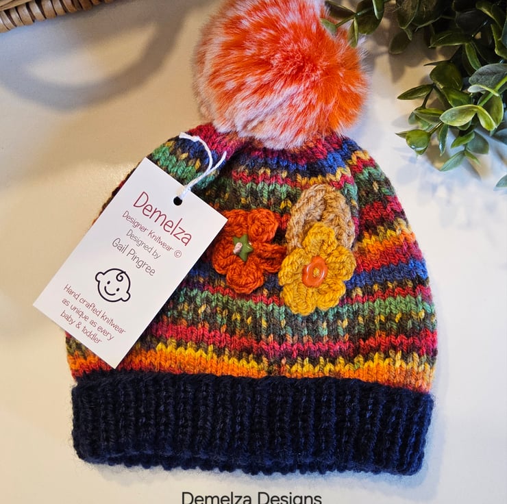 A sweet practical baby girl's hat designed and hand crafted in Cornwall using quality branded British machine washable acylic yarns. It has a 8cm fluffy pom pom. On the inside back seam a luxury soft damask Demelza Designs garment label has been attached providing the care instructions woven within it for lasting reference. A branded garment swing tag is attached to the outside as proof of it's designer origins if gifting.