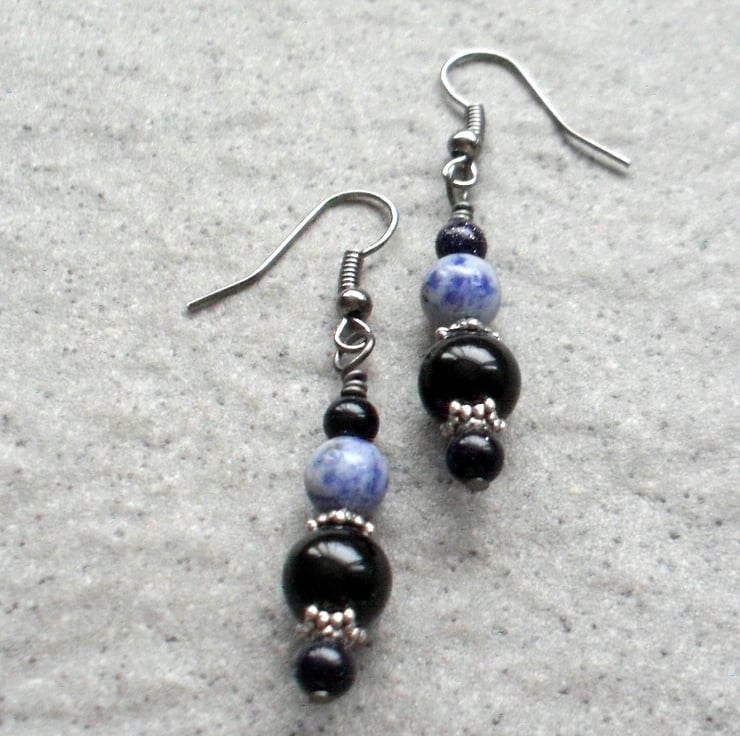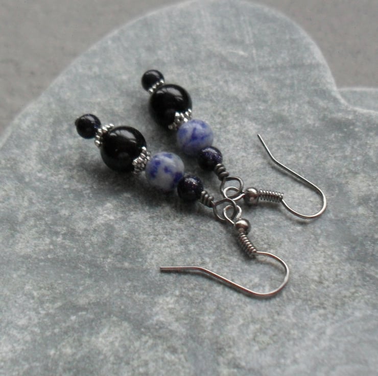 Black onyx, blue jasper, blue goldstone beads and silver tone bead caps are attached to black tone ear wires.