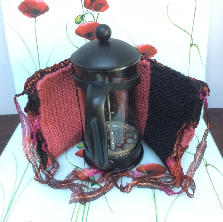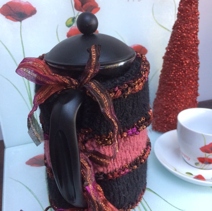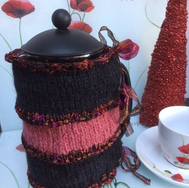 This is a stunning luxury handmade coffee cosy hand-knitted by me, Poppy Kay. I have named this colour design Blackberry.