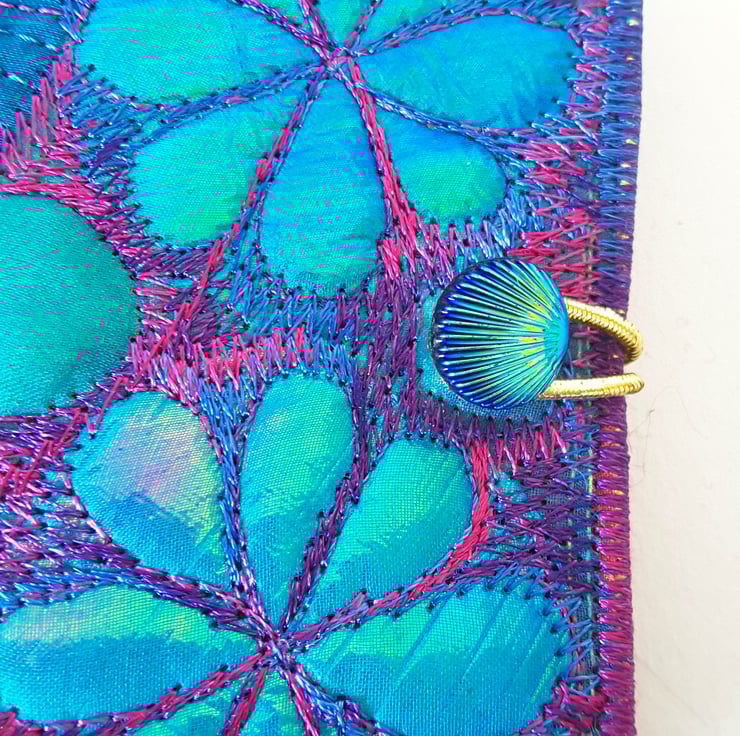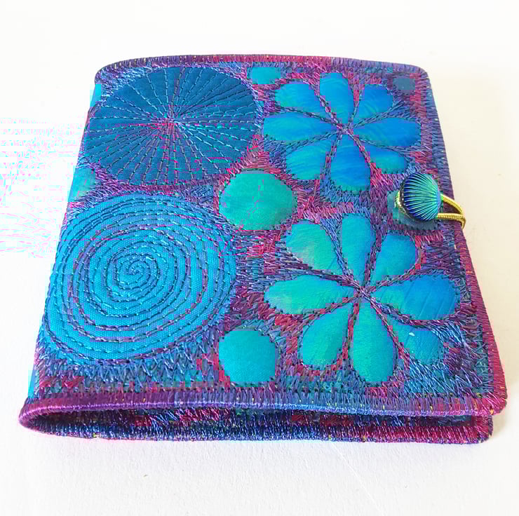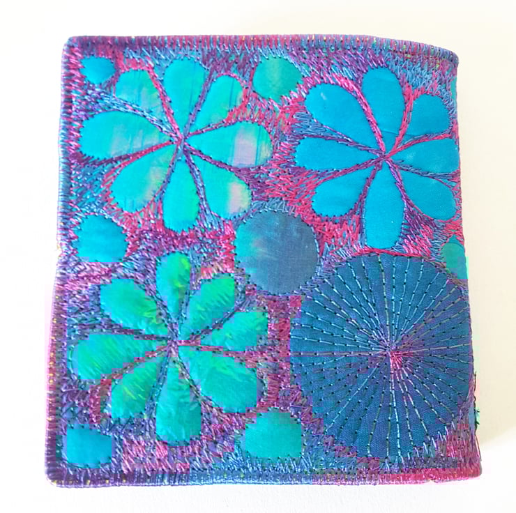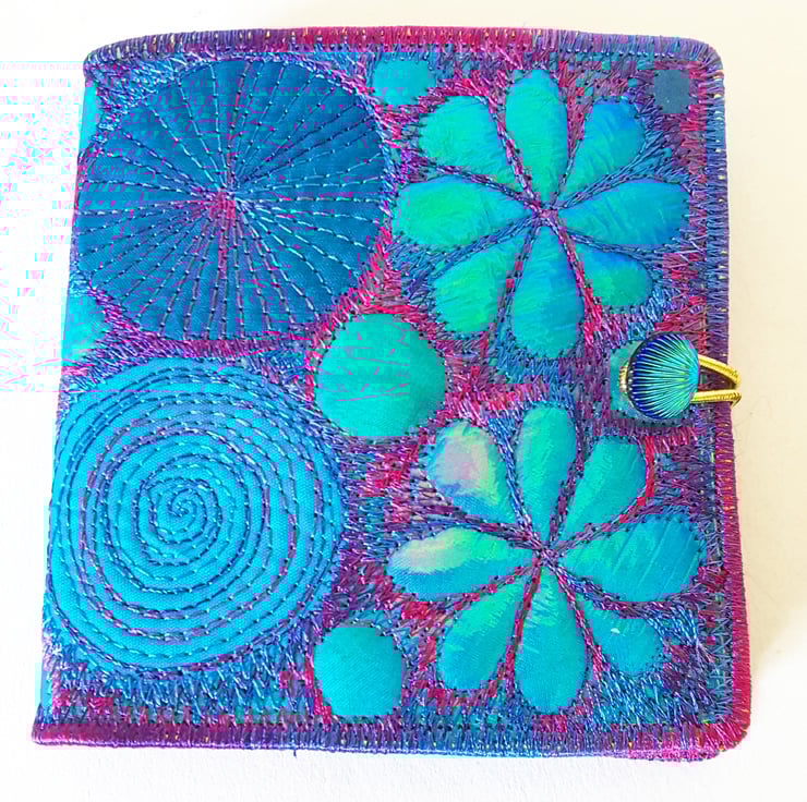 Made from layers of fabric including hand dyed Egyptian cotton and silk fabrics using the free machine embroidery style of sewing