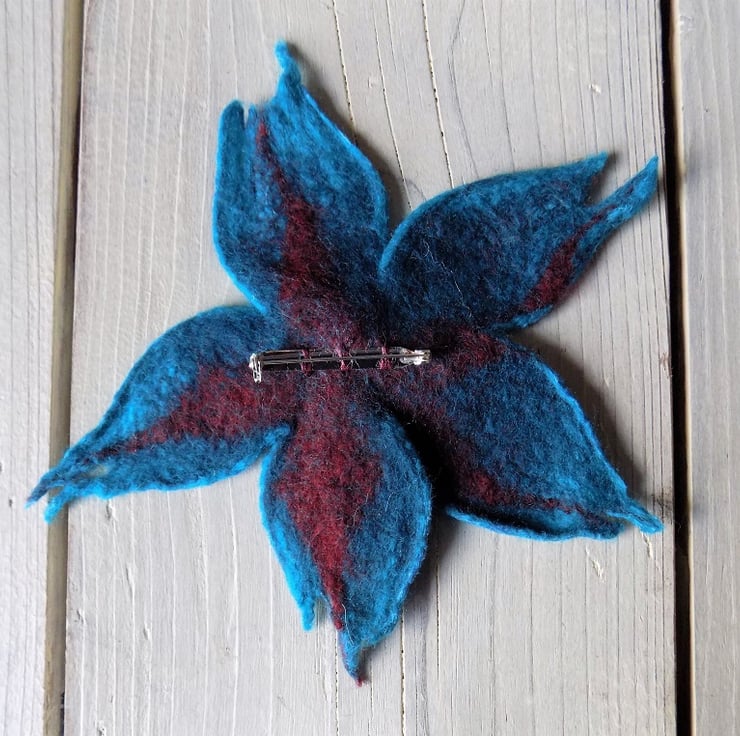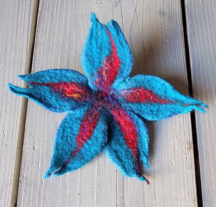 Felted flower brooch: merino wool and silk in bright teal and red