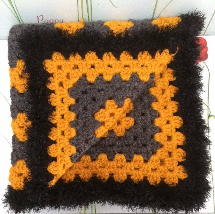 The blanket is crocheted in alternating charcoal grey and mustard colours and the edging is done in a gorgeously soft black. It's a really lovely warm blanket for the winter months.
