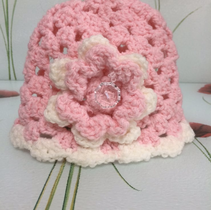I have hand crocheted this beautiful baby hat from soft acrylic yarns.