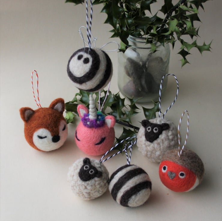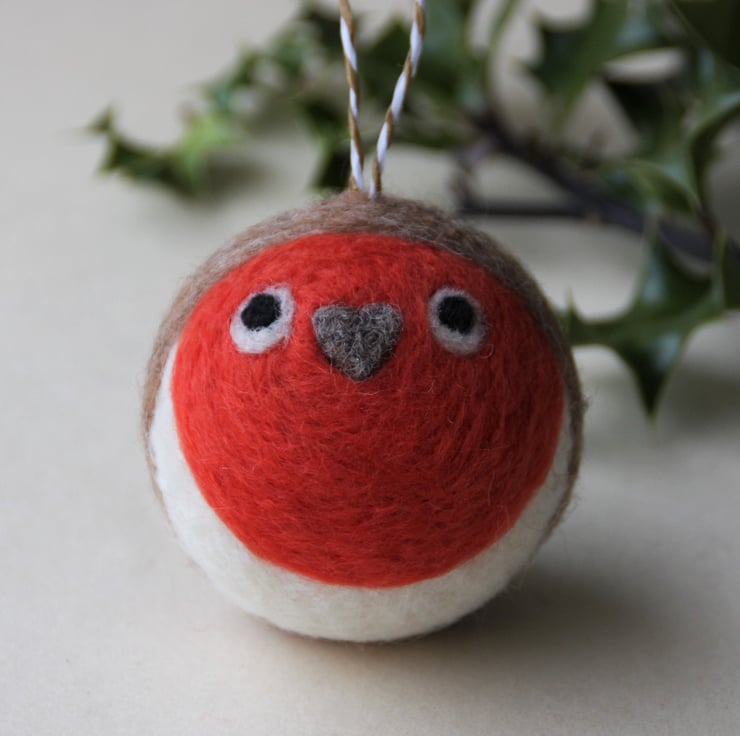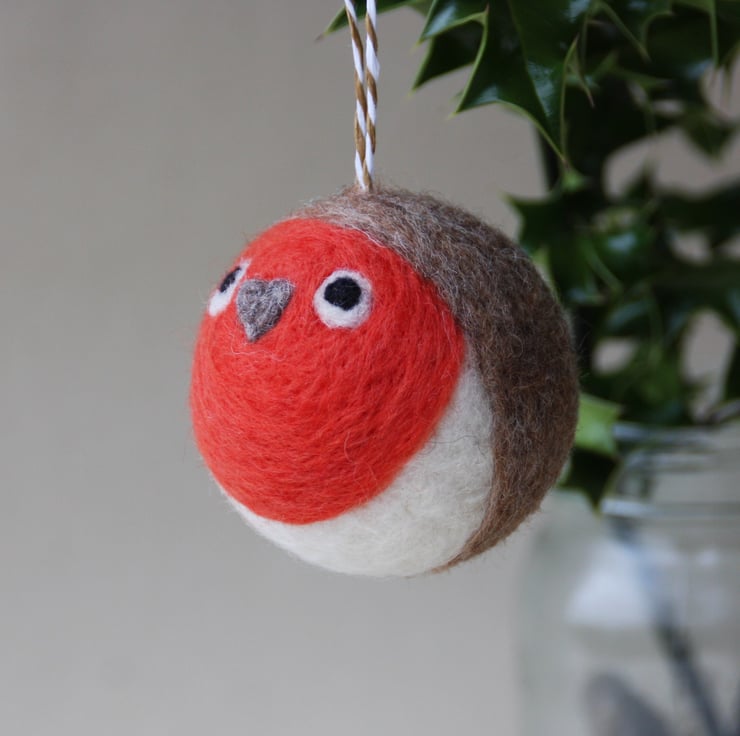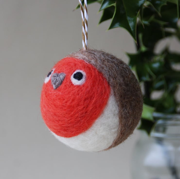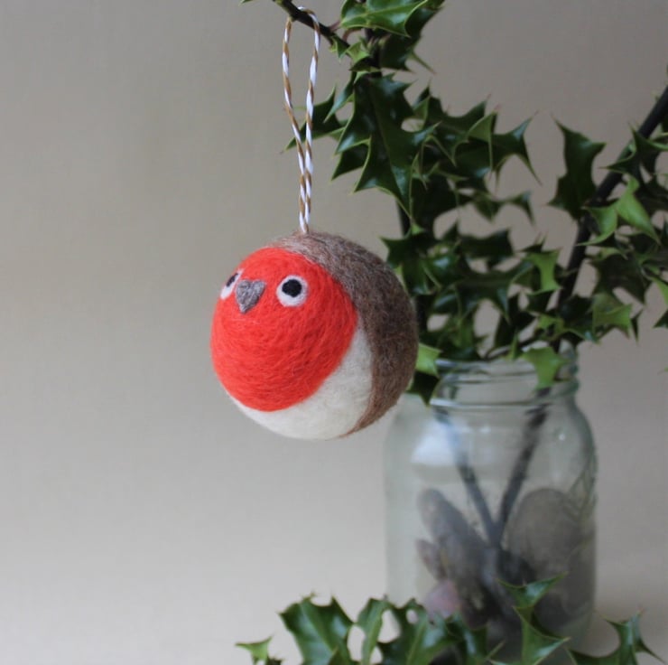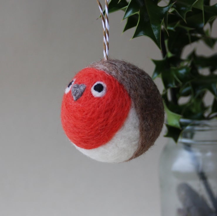 Handmade, needle felted robin Christmas tree decoration in. These baubles measure approximately 6cm diameter and have a loop for hanging. As these ornaments are individually handmade, colours and design may vary slightly.