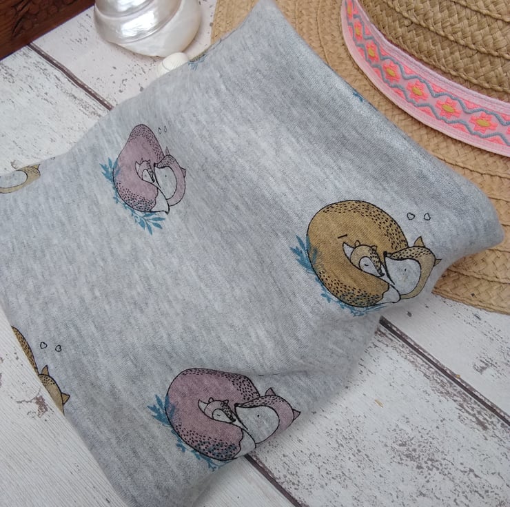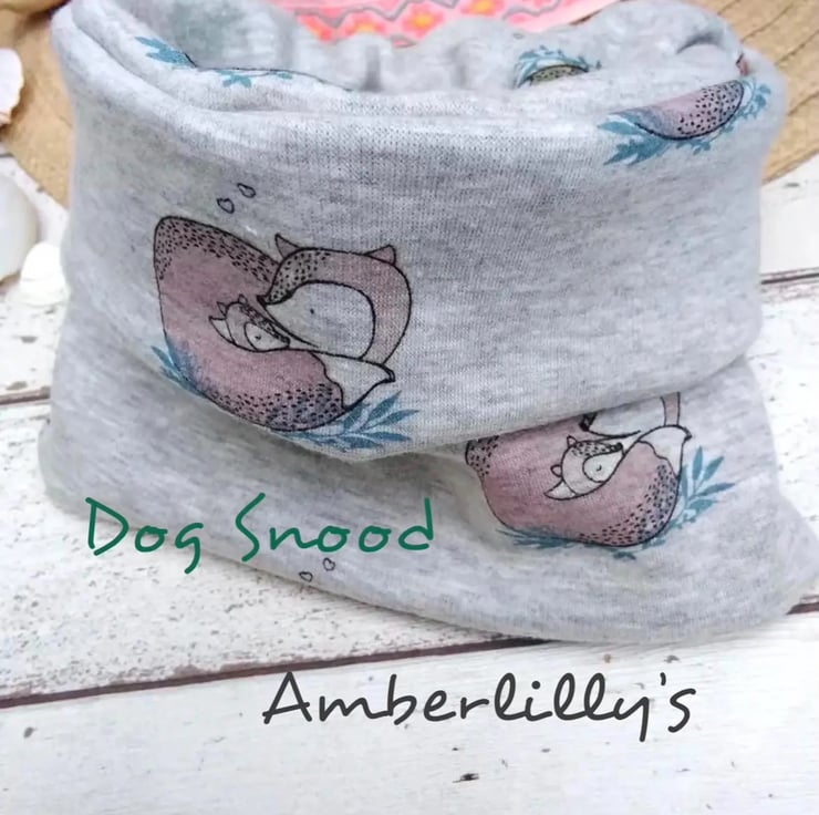 How cool is this dog snood. Double sided in Jersey pale grey with fox design. Suitable for a medium neck. A nice a cosy addition to your dogs wardrobe. Easy to just slip over your dogs head. A nice for the colder season. Handy for protecting the ears.