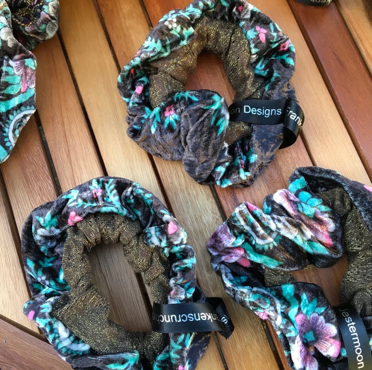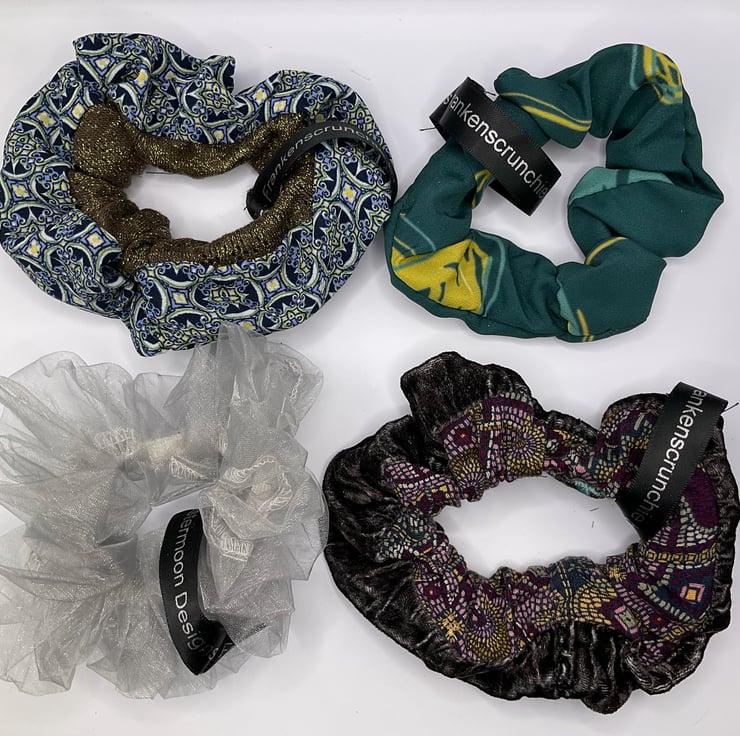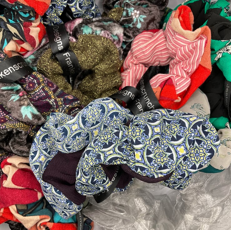 I work a lot with textiles and hate fabric waste, I also like old fashioned horror writing, hence frankenscrunchies and bands were born. I take odds of fabric, either second hand or new (all laundered) and make what I can, scrunchies and hairbands at the moment, but looking to find other things to do with ends of fabric. Each piece is unique, sometimes I leave the buttons of shirts on them or other quirky elements of the donor fabric, I always think about the colour and pattern combinations to make each product aesthetically pleasing, and hopefully something to covet.
