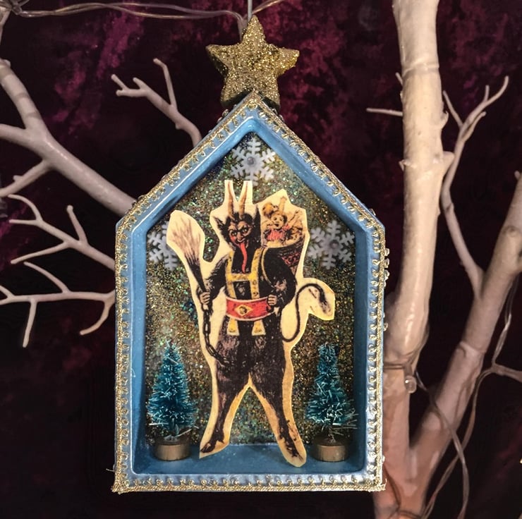 Small cute handmade kitsch Christmas Krampus shrine that can be hung on a Christmas tree.