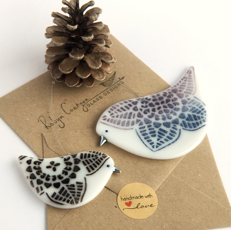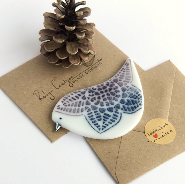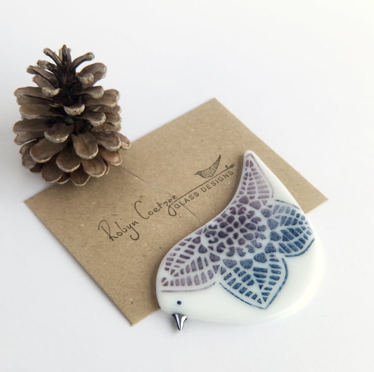 One medium opaque white glass bird with my signature blue and purple design. It is strung on a length of silver wire as shown in the image and arrives in a brown envelope with a 'handmade with love' sticker. I also have a smaller size available, see photograph for comparison.
