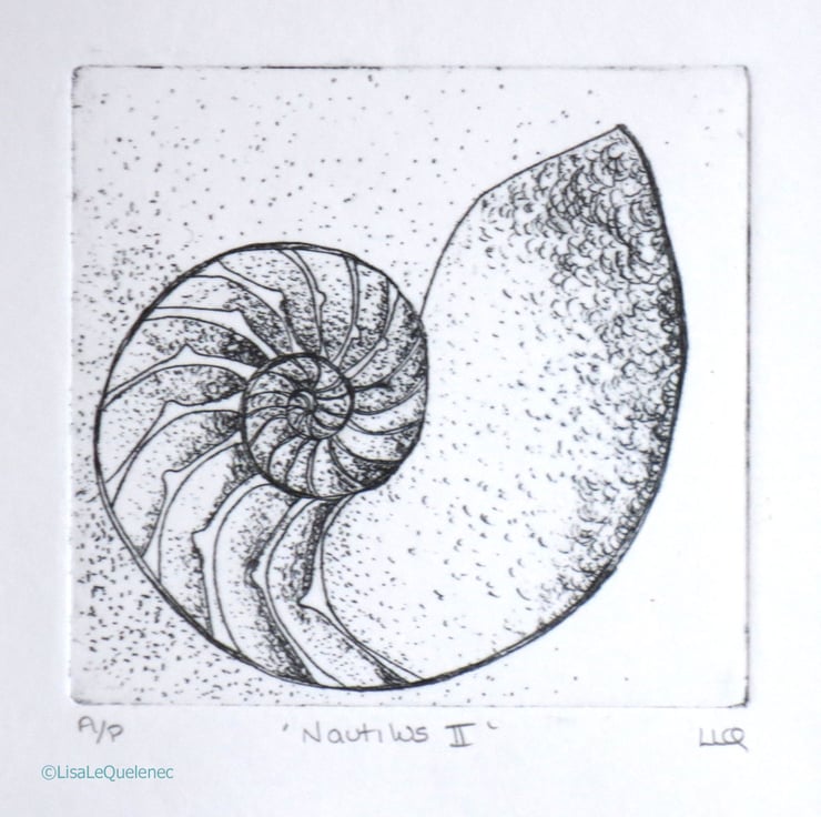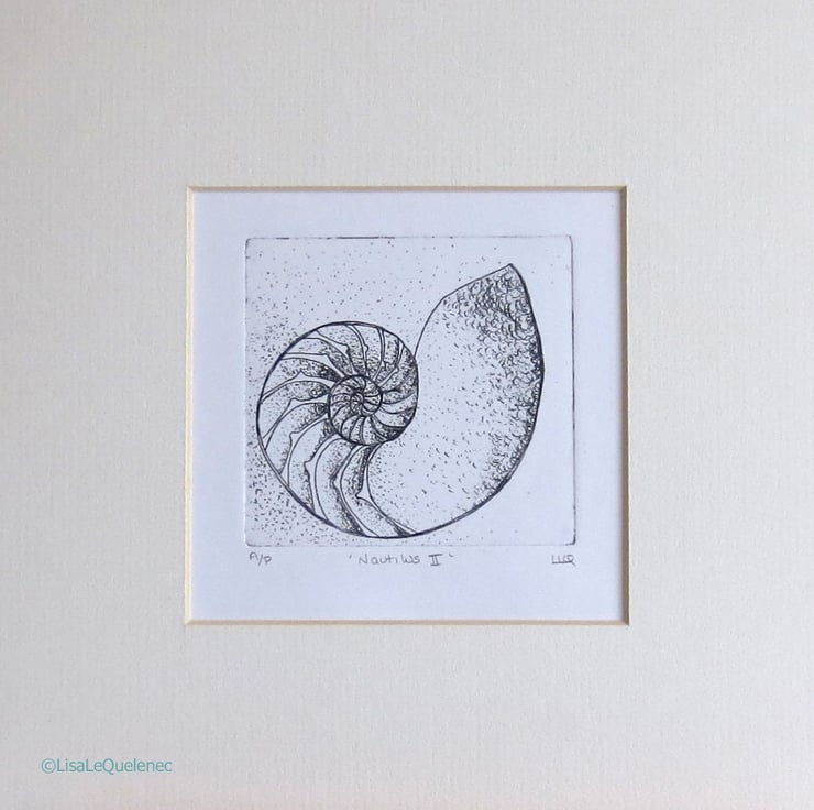 Original handmade etching print of a chambered nautilus shell cross section printed in black ink on white paper. The first artist proof print in an edition.