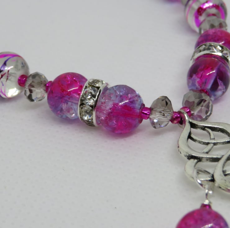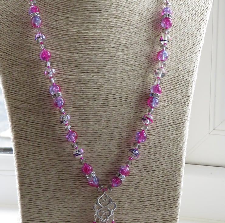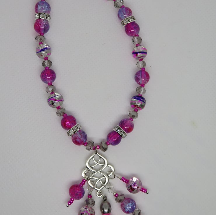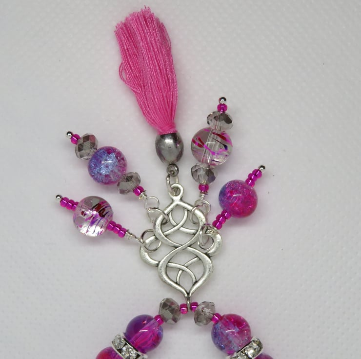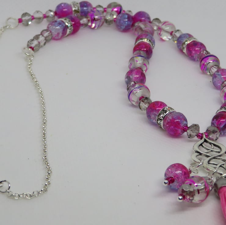The focal point of this necklace is a tibetan silver knot connector with beaded dangles and a pink tassel with stainless steel cap suspended from it. The connector is attached to a gorgeous string of crackle beads, drawbench beads, crystal rondelles, diamante spacers and seed beads, all in shades of pink, mauve and silver. There is a length of silver plated chain attached to each end of the necklace and it fastens with a simple lobster clasp.