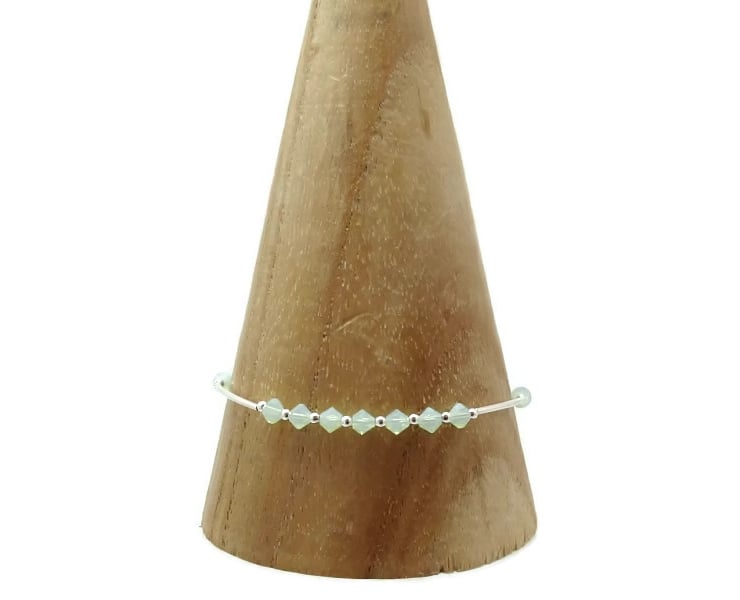 A pretty Bridesmaids bangle style Sterling Silver handmade bracelet with opalescent green 4mm Swarovski Crystals.