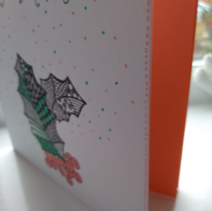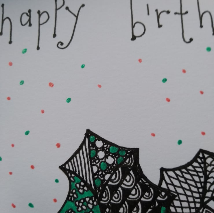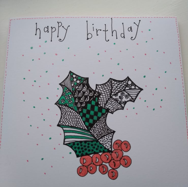 A completely handmade and uniquely designed card. Consisting of pristine white quality card which I have hand drawn Holly leaves and berries. Hand coloured with glitter gel pens. Happy birthday hand written in black ink.
