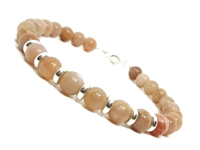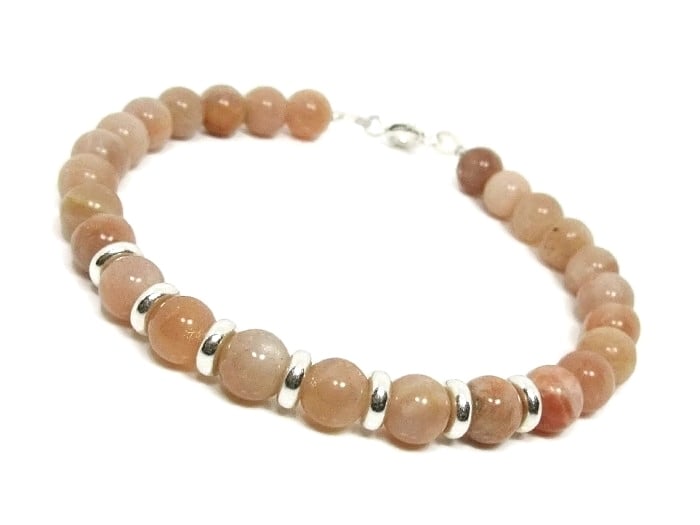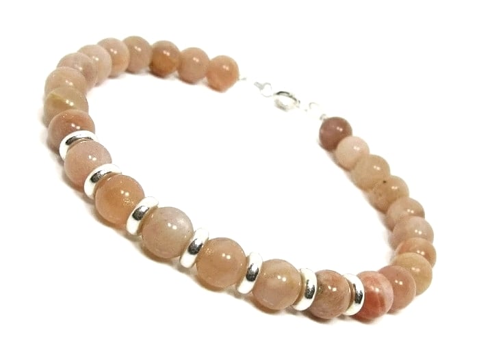 For this ladies peach pink Sunstone bracelet, I've used plain round 6mm semi precious gemstones giving it a slimmer style than my faceted Sunstone bracelet.