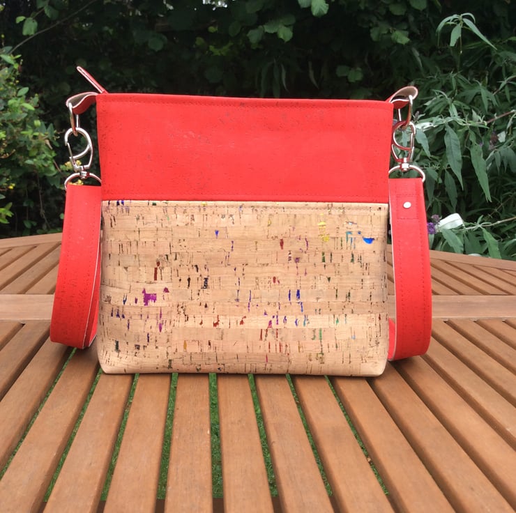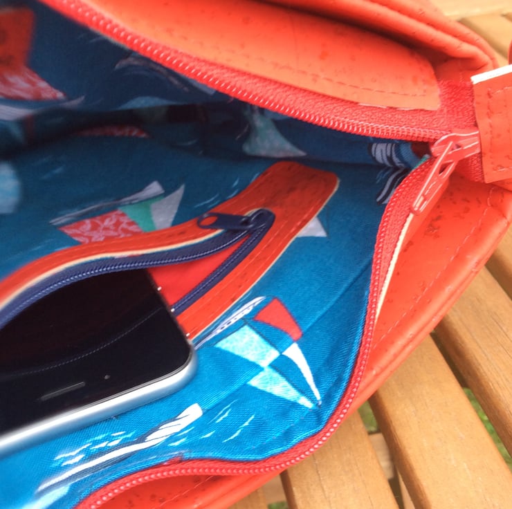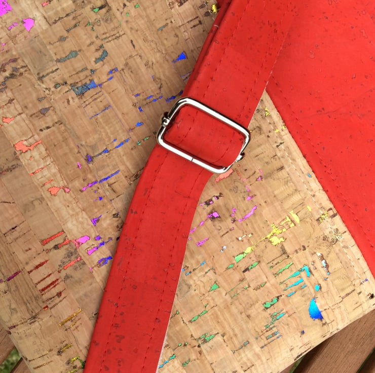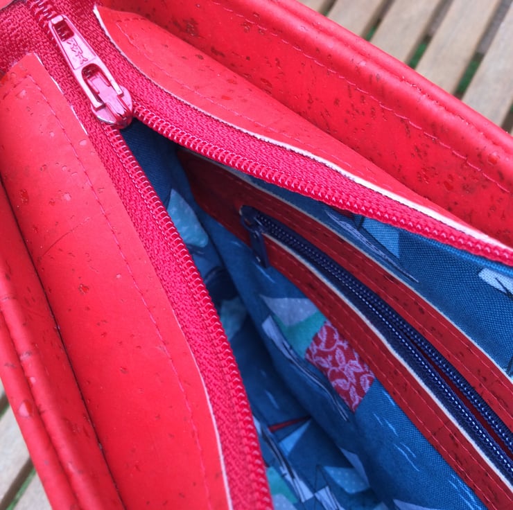 The outer cork fabric is red at the top and the bottom is natural cork with multicolour iridescent flecks. The strap is made of the red cork fabric. The lining has a yacht design in blue and red with a red inner pocket.