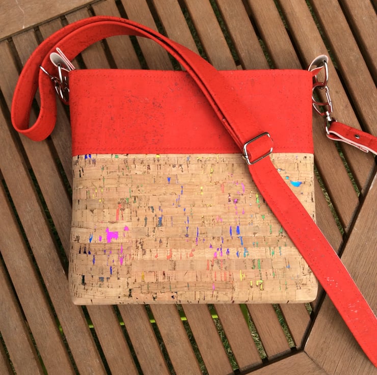 This bag is handmade from my own design using cork fabric and is fully lined with cotton fabric. It has a zip closure and an inner zip pocket. The generous strap is adjustable allowing the bag to be worn as a cross body or shoulder bag.
