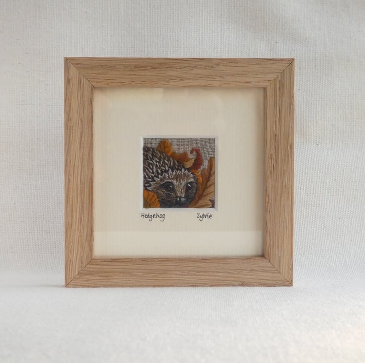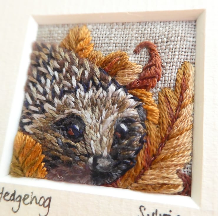 I used a style the I call "drawing with threads" to make this little hedgehog picture. The image is built up using strands of embroidery thread and stitches of varying lengths and colours. It's time consuming but it does allow lots of detail.