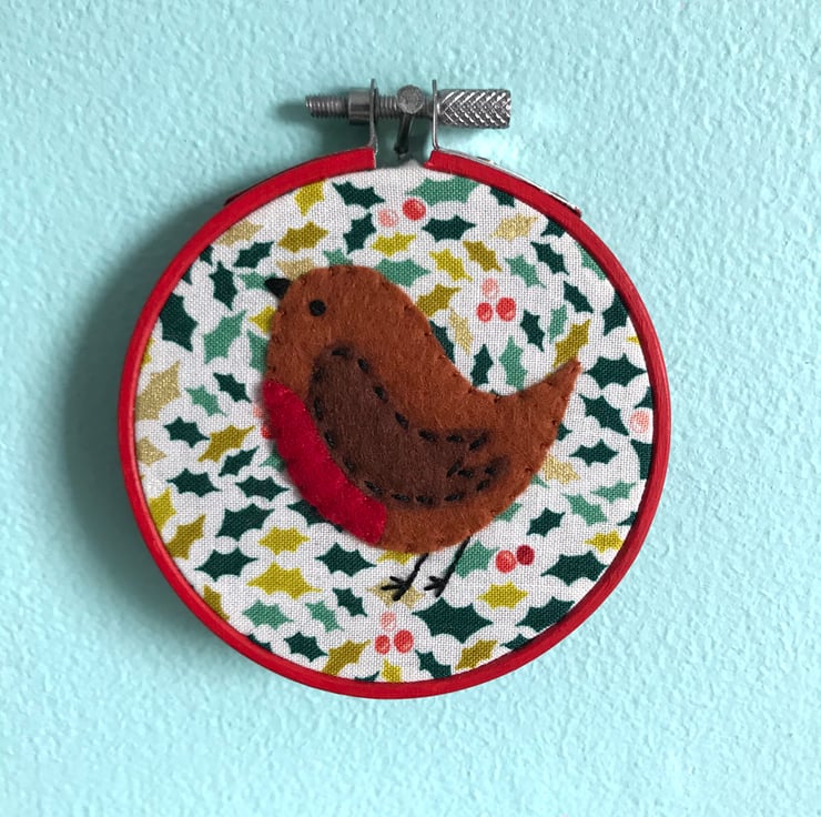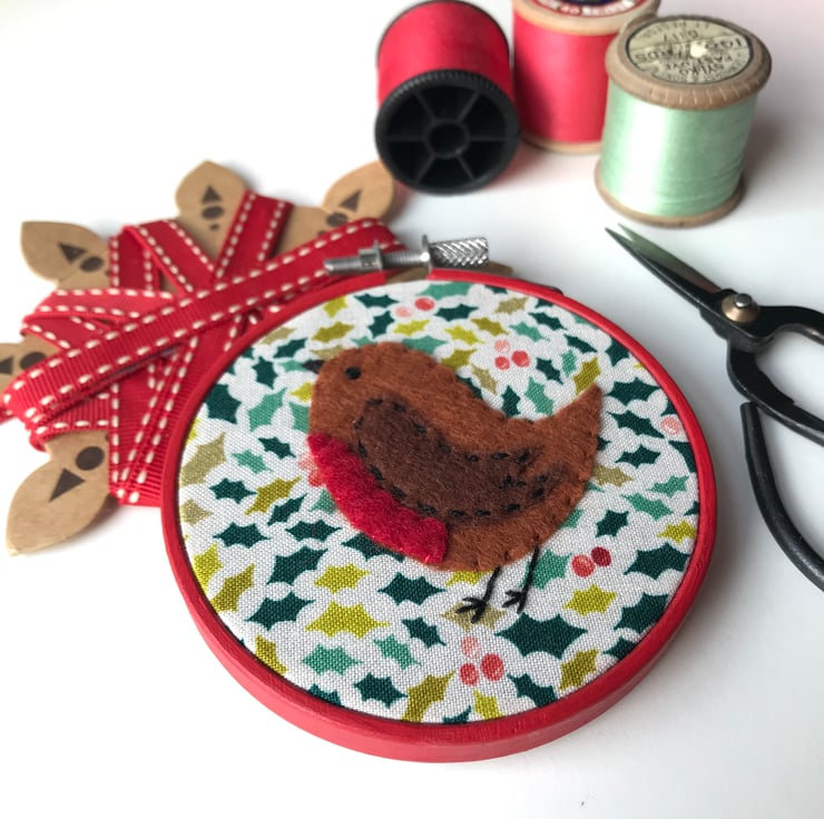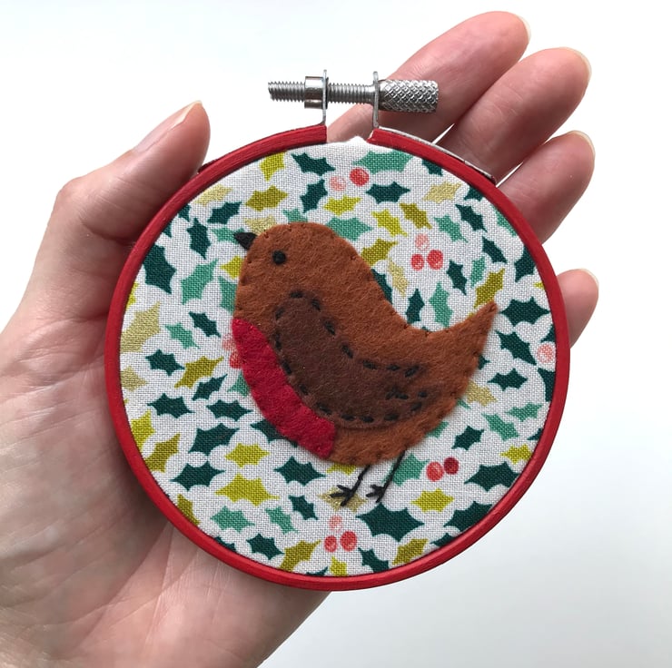 The robin is carefully hand cut from wool felt and is hand stitched into place using embroidery thread, with an embroidered eye and beak.