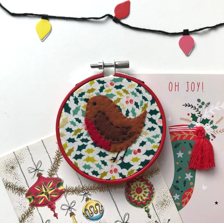 The hoop is small and light enough to hang on a Christmas tree, and sturdy enough to be propped on a shelf with Christmas decorations. The little robin will bring festive cheer to any decoration scheme!