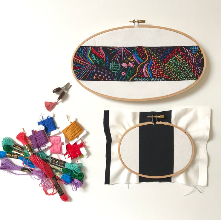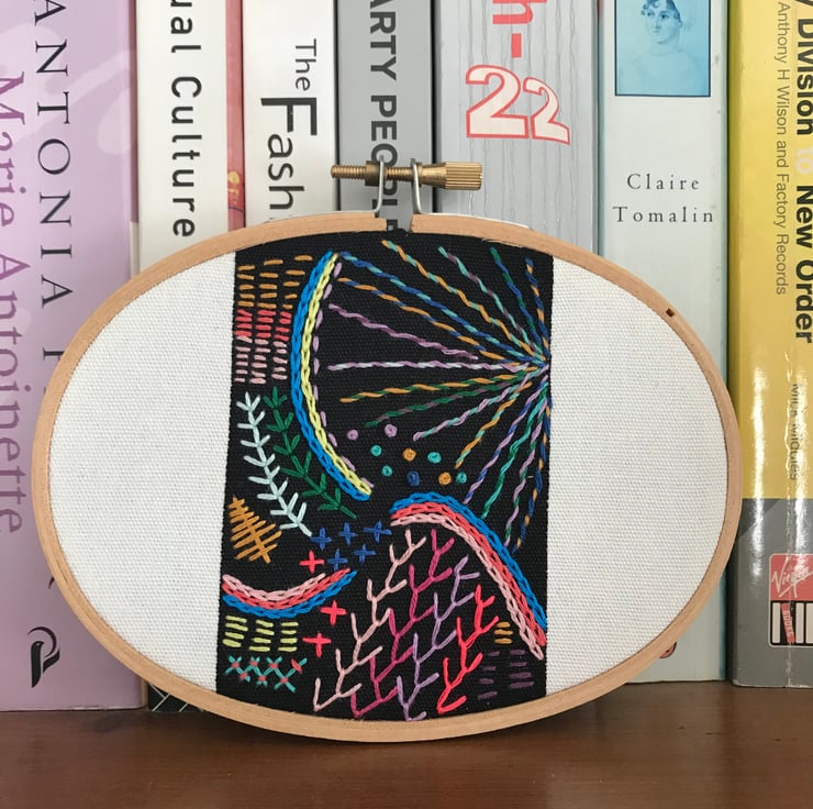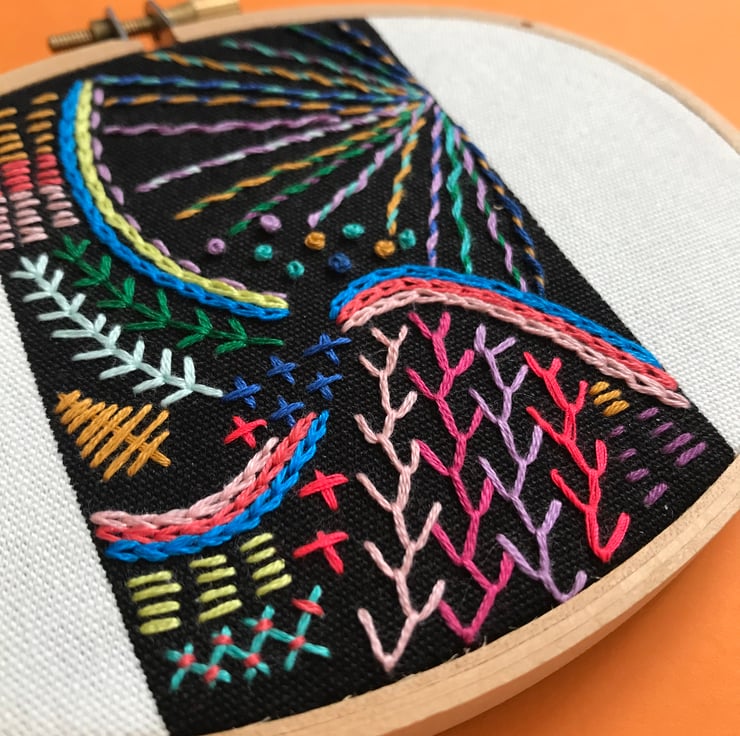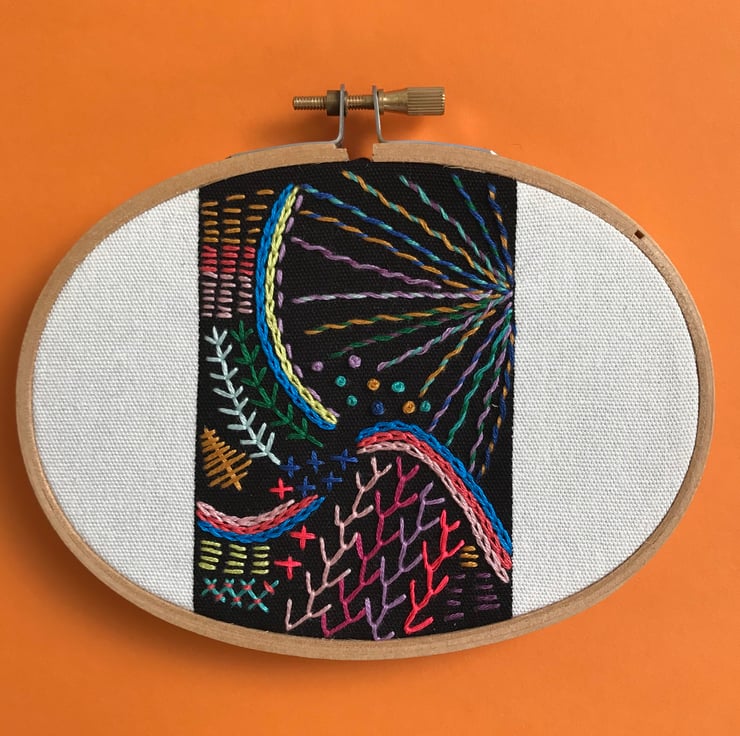 A contemporary take on the traditional embroidery sampler. I have hand embroidered the black stripe on the fabric with bright colours, in an ‘freestyle’ organic pattern. Using neon thread, and contrasting colours together to create a burst of colour, texture and pattern.