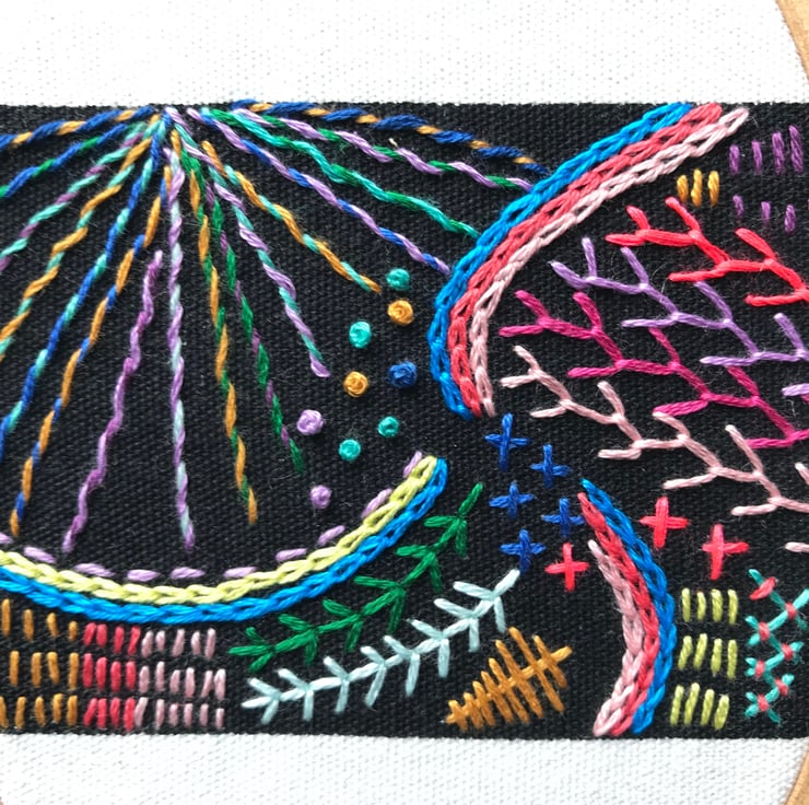 Stitched using DMC cotton embroidery thread, and Rico Neon thread onto thick black and cream cotton canvas, using chain stitch, fern stitch, french knots, whipped running stitch, herringbone stitch and feather stitch.