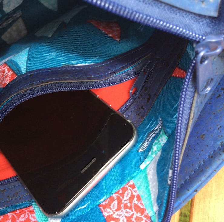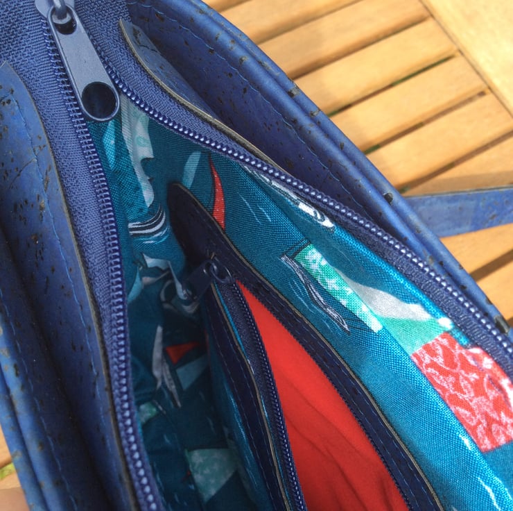 The outer cork fabric is navy blue at the top and the bottom is natural cork with multicolour iridescent flecks. The strap is made of the blue cork fabric. The lining has a yacht design in blue and red with a red inner pocket.
