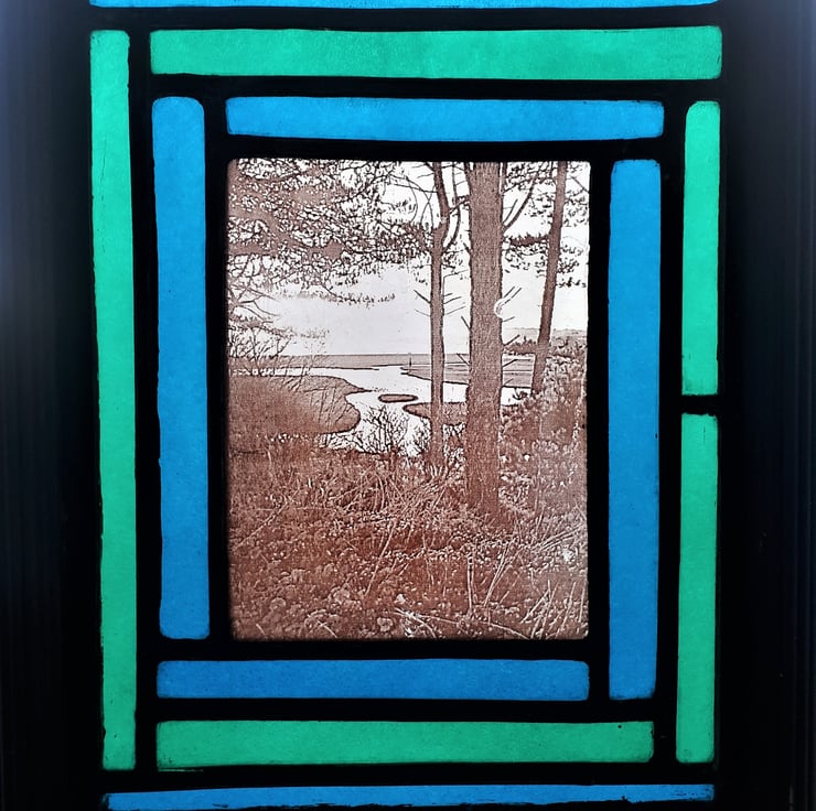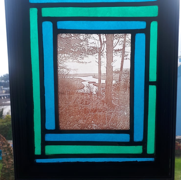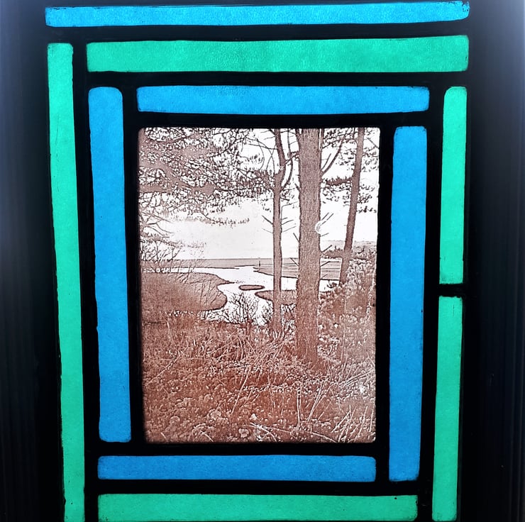 This gorgeous art glass panel is made using traditional leading techniques; mixed with the contemporary process of firing photographs onto glass.. I have used deep aqua and turquoise blue for the border and the photograph was fired onto iridescent glass which gives a lovely rainbow shine.