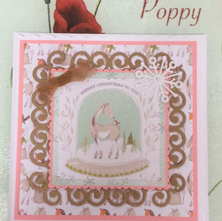 The design is a really cute ornate reindeer with a red breasted robin on its back, on a snowy hill inside a snowglobe. I have hand-cut and decorated every element on the card.