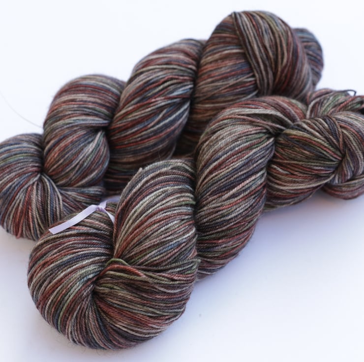 Mottled shades of rust, brown, blue-grey, grey, olive and pewter grey (undyed). This is a 4-ply weight yarn with a a versatile superwash merino base, with cosy, soft yak fibre and a little nylon for strength. The natural grey colour of the Yak gives the colours beautiful richness and depth. There is one skein left. Photos taken and edited in bright but wintery natural light.