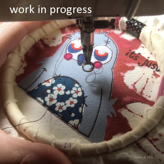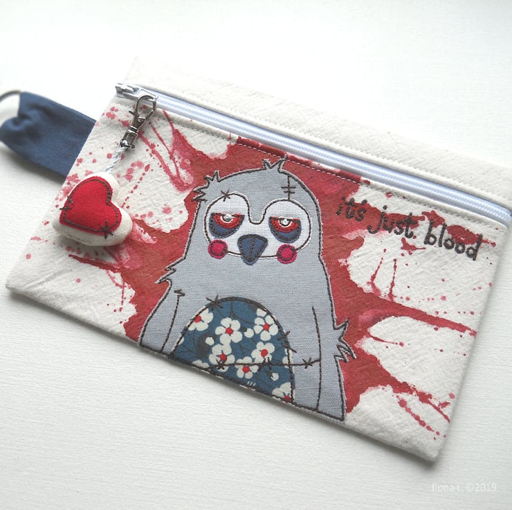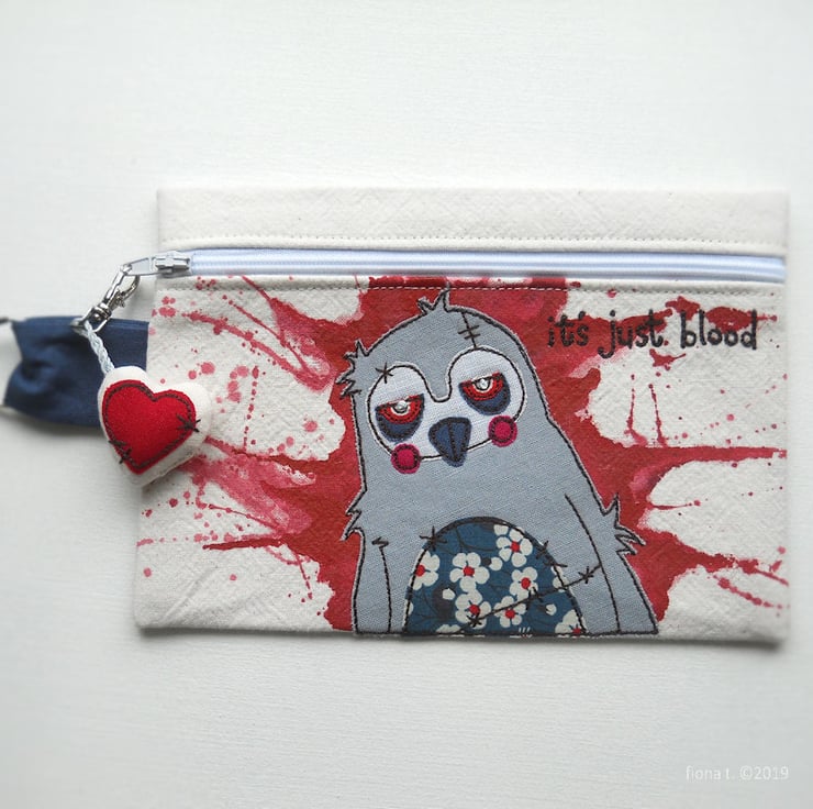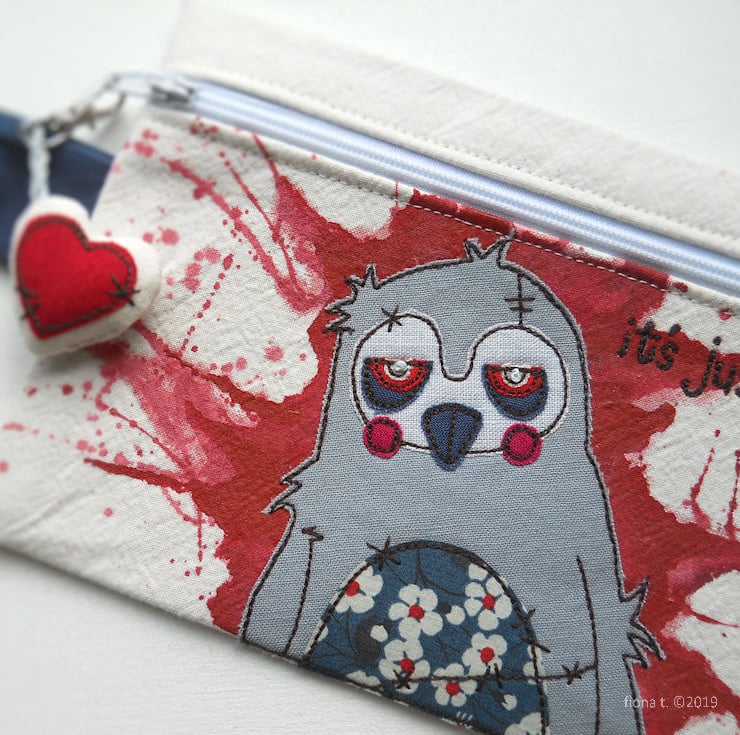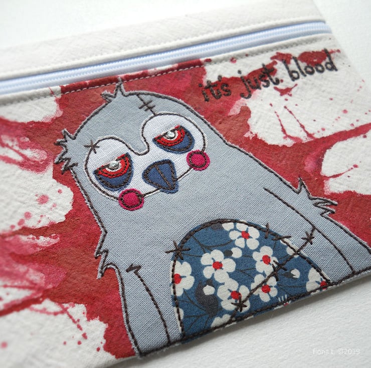 this miserable zombie penguin is constructed from blue & grey cottons and navy floral liberty print lawn, she scowls against a blood spatter background. each tiny component is hand-snipped, layered then appliqued onto cotton calico. the detail is stitched on freestyle, using free motion embroidery.