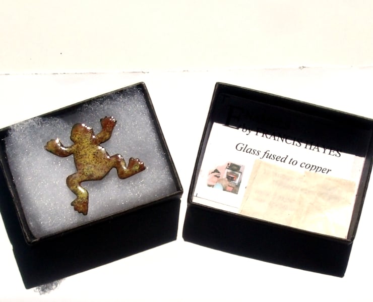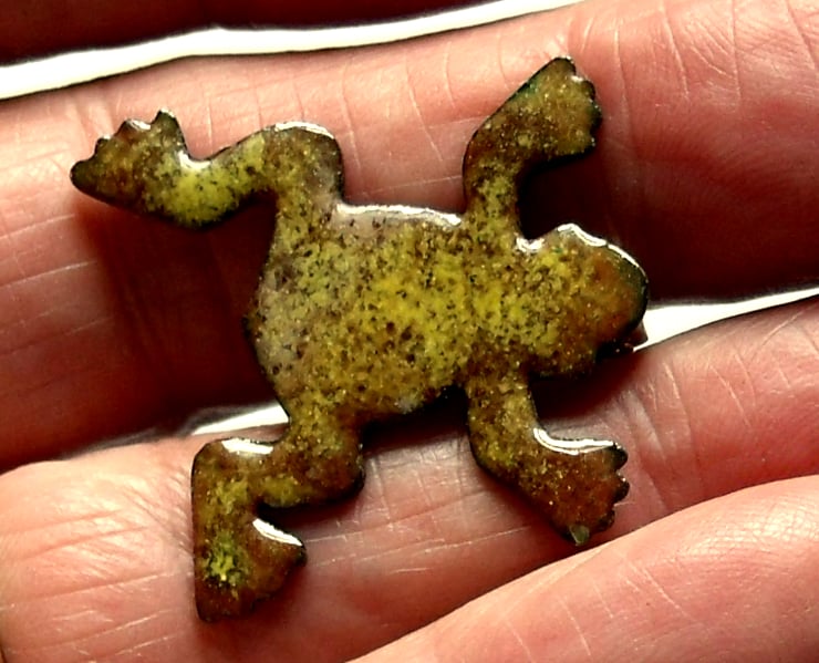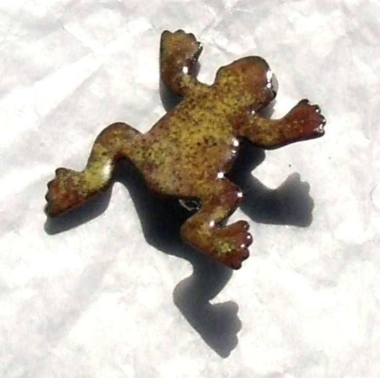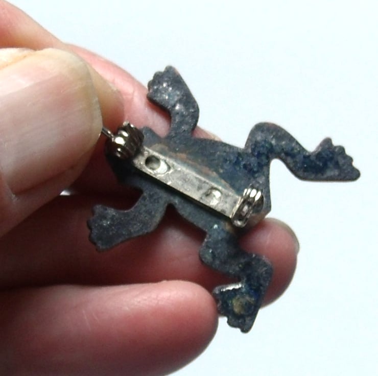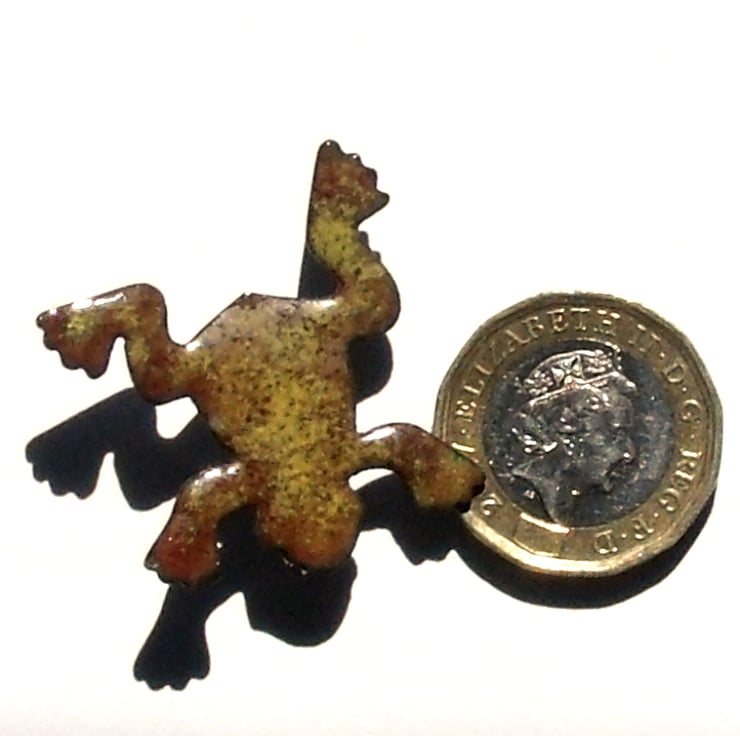 The frog measures 30mm by 30mm at its widest and longest. I have soldered a 20mm brooch bar to the reverse. The pin secures with a rotating catch.